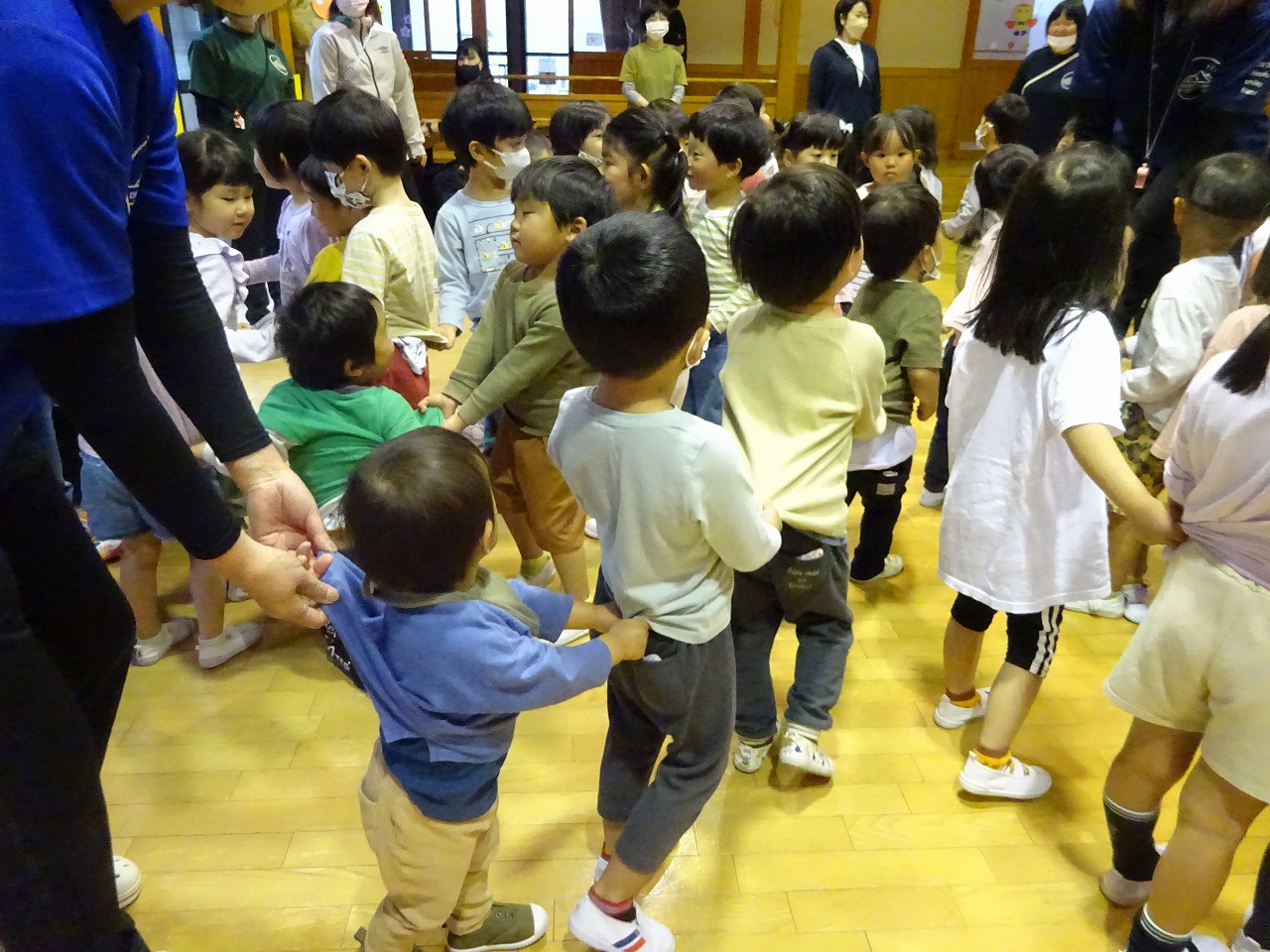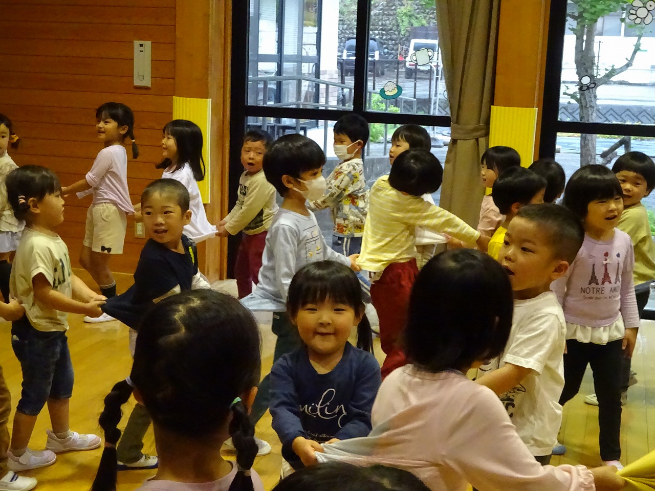 遊戯室で貨物列車に仲間してもらったり、お菓子つかみ競争にも参加させてもらいました。 遊戯室でのサーキットあそびやバスの部屋、支援センターでの遊びにも参加して楽しい時間を過ごしました。 お弁当も遊戯室で一緒に食べ、賑やかに愛情いっぱいのお弁当を美味しくいただきました。