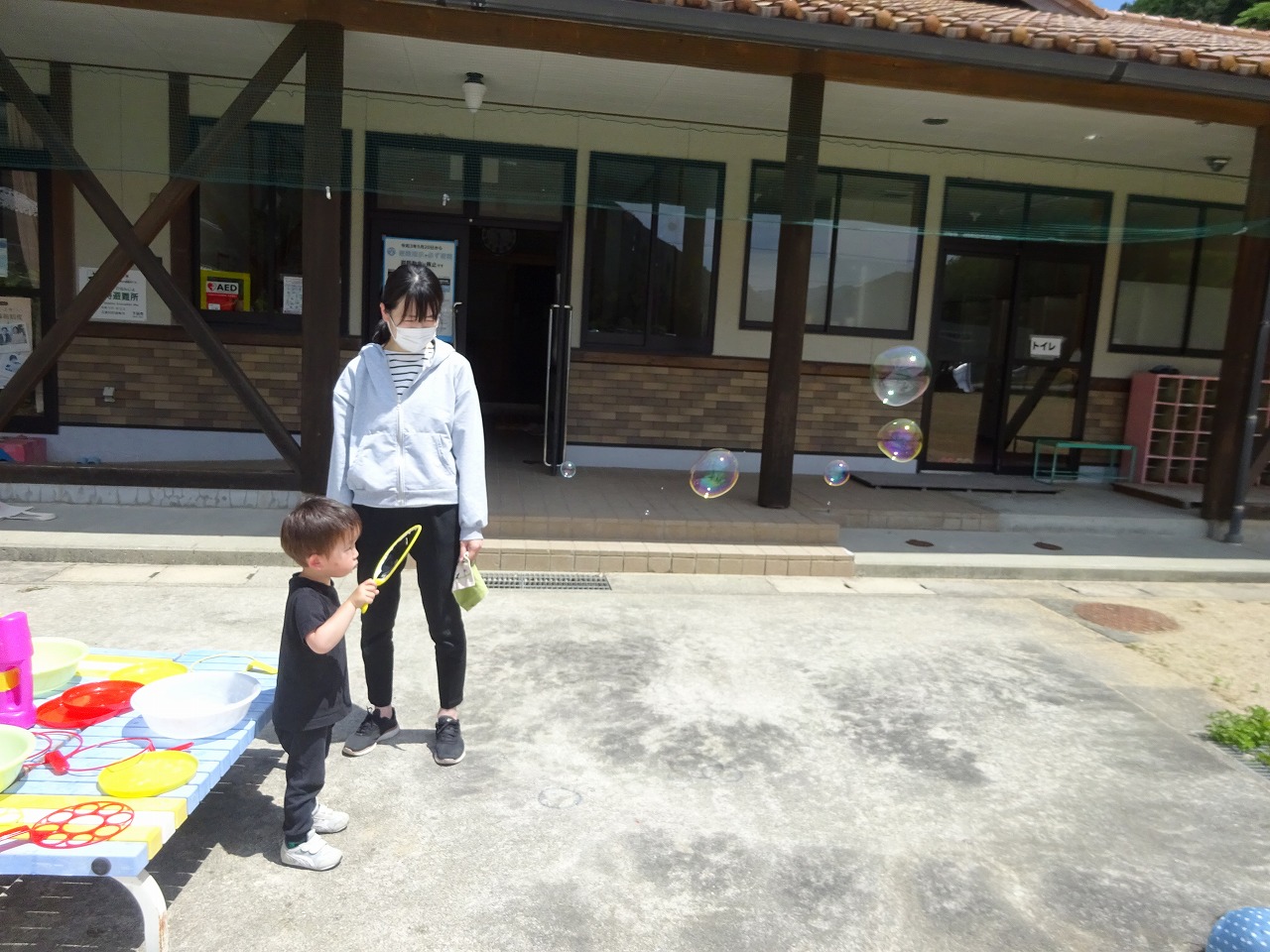うさぎ組の子どもたちが行う予定にしていたので親子の方々も誘いました。5組の親子が参加してくれました。 最初は、上手くしゃぼん玉が作れなかった子どもたちでしたが、3歳の子どもたちは口で吹いたり、道具を使って徐々にコツをつかみしゃぼん玉ができてきました。市販のしゃぼん玉液よりも洗たく糊、洗剤、水を混ぜたしゃぼん玉液の方が大きいしゃぼん玉ができて子どもたちは大喜びでした。