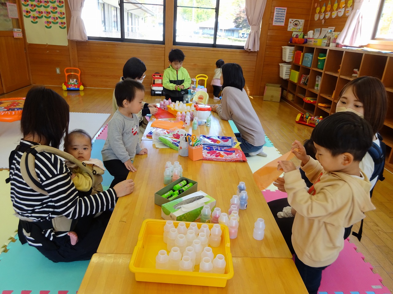 ジュースはヤクルトの容器に果物のシールが貼ってあり、その果物の色に合わせておはながみを入れました。