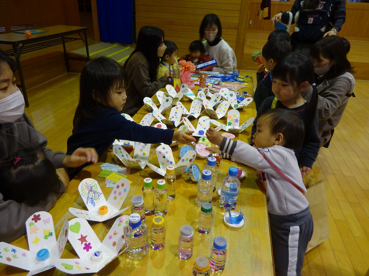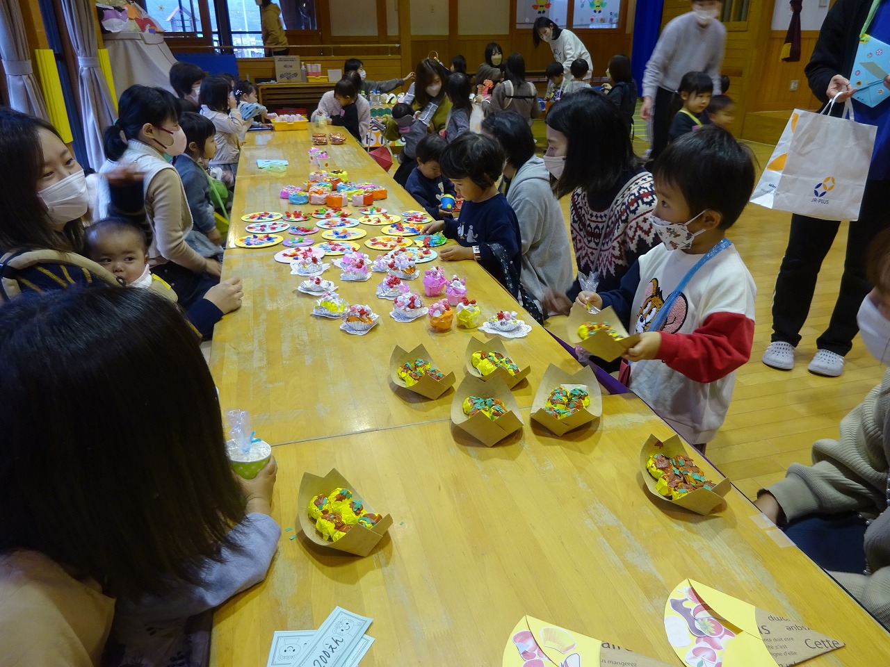 19組44名 わかあゆSTの子どもたちも参加して行いました。 食べ物コーナー・おもちゃコーナー・ポップコーンコーナーのお店を出しグループに分かれて行いました。 自分の財布からお金を出し欲しい物を買ったり、また品物をじっくり選ぶ様子もありました。 初めて室内でのコラボ行事でした。また、来年度もたくさんの品物を作ってお店屋さんごっこをしたいと思います。