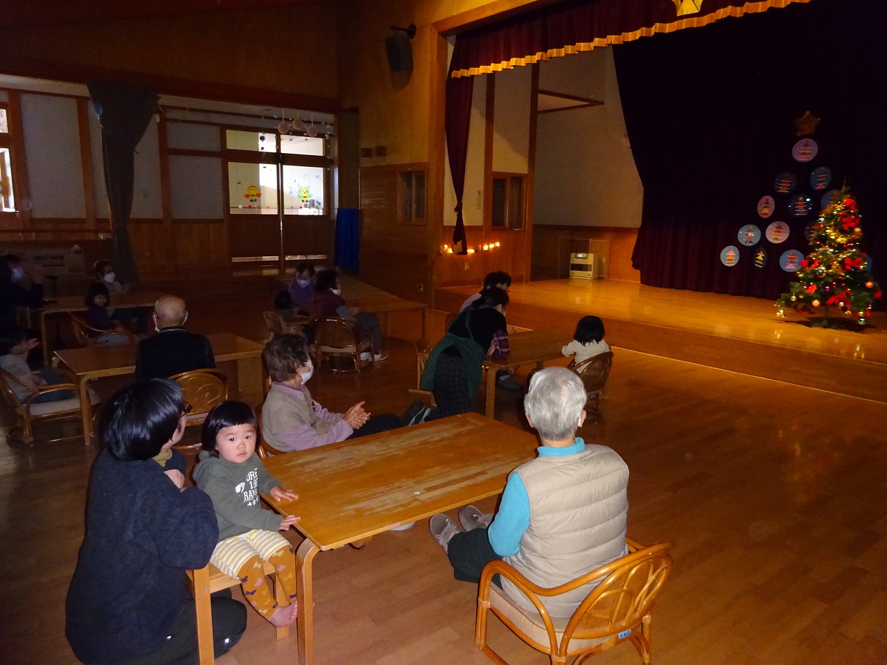 11月のお楽しみ会はもうすぐクリスマス🎄ということで、ほのぼの館の方と一緒にクリスマスツリーの製作をしました。おばあちゃんたちに折り紙を折ってツリーを作ってもらい、子どもたちは星や雪などツリーに飾りを貼っていきました。できあがった作品を遊戯室の壁面に飾り、電飾されたクリスマスツリーを点灯しました。ステキなクリスマスの飾りができました。クリスマス会もほのぼの館の方と一緒に行うことを知らせ、サンタさんが来ることを楽しみに待つ子どもたちでした。