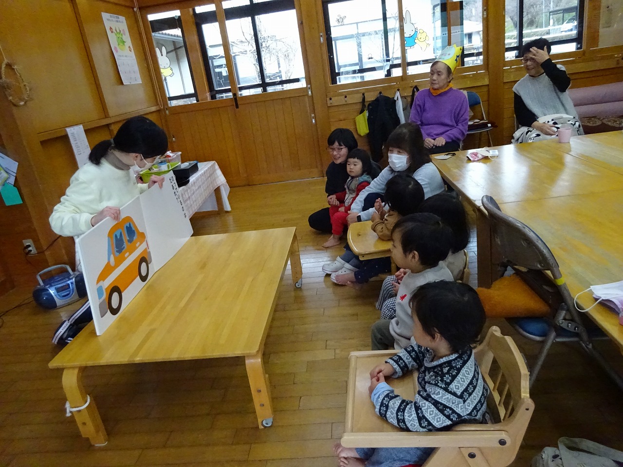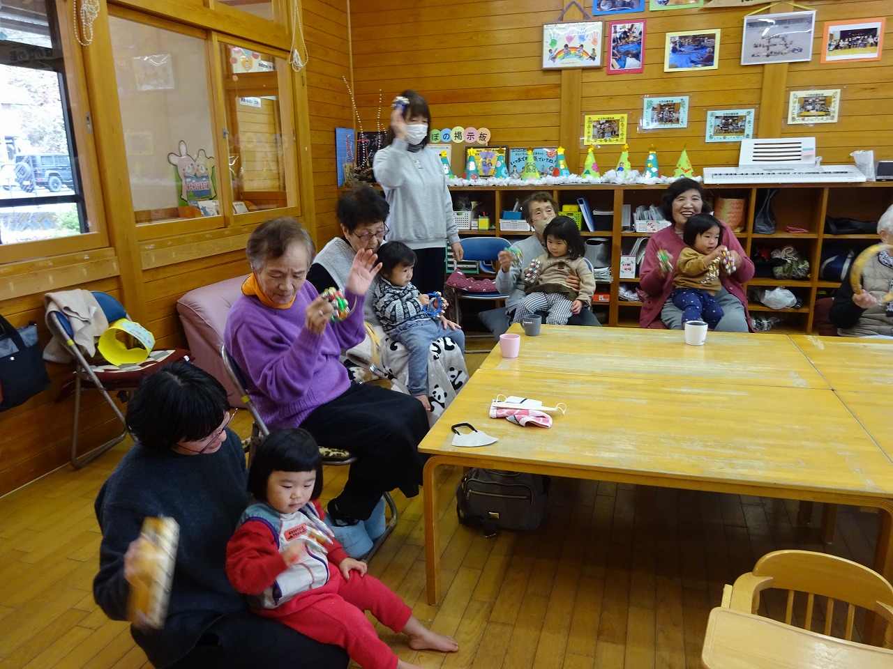 12月生まれはほのぼの館のおばあちゃん!インタビューにも元気いっぱいに応えてくれました。お楽しみは「乗っているのはだあれ?」の大型絵本。たくさんの動物が乗っていたね!最後にみんなで「ジングルベル」の曲に合わせて楽器あそびをしました。鈴やタンバリン、カスタネットをリズムに合わせて鳴らしたよ!おばあちゃんたちも楽しそうでした‼
