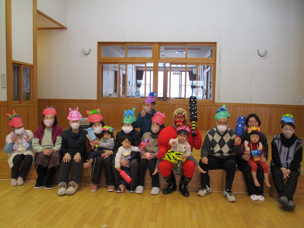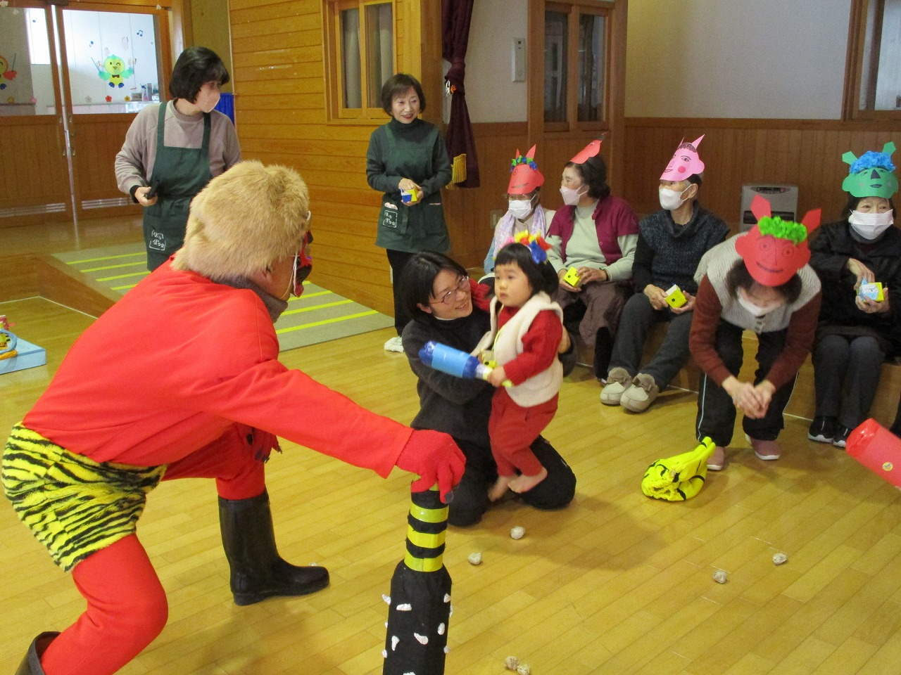 ほのぼの館の方と一緒に行いました。節分のお話を聞いた後、おばあちゃんたちと鬼のゲーム(輪投げ、的当てなど)をして遊んでいると…「ドン!ドン!」大きな音が聞こえてきて、わかあゆにもこわ〜い鬼がやって来ました!子どもたちは豆をまくのをすっかり忘れて逃げたり、泣いたり大騒ぎ!おばあちゃんたちは鬼に襲われながらも豆をまいて鬼に立ち向かって下さったおかげで子どもたちも豆をがんばって投げ、鬼を追い払うことができました。最後はすっかり良い鬼になって再び登場!!まだまだ怖かったけど一緒に写真を撮ったり抱っこしてもらったりして鬼と仲良くなりました。