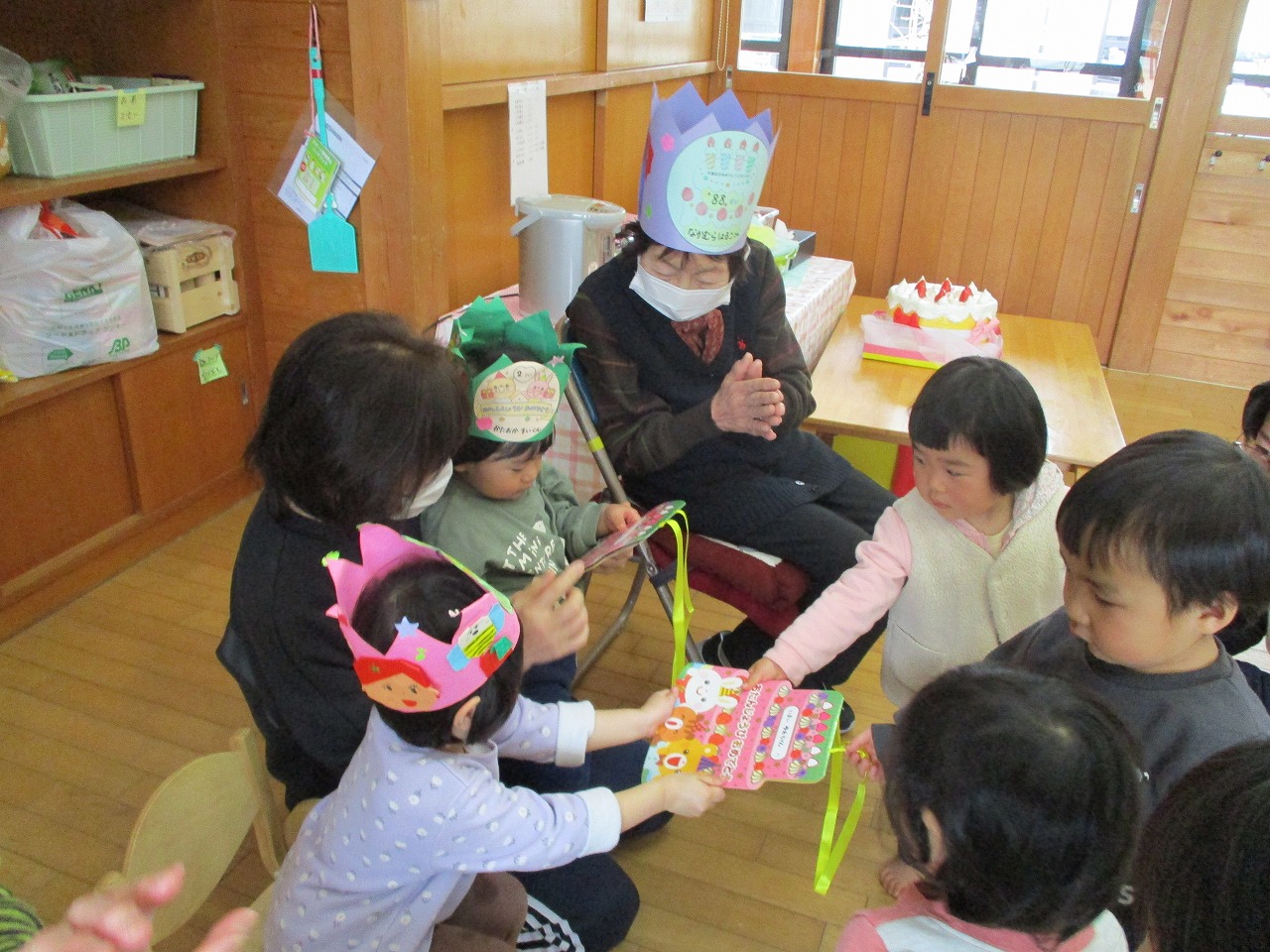 3月は2人のお友だちと2人のおばあちゃん、4名がお誕生日でした。インタビューやろうそく消し、みんなで盛り上がりました! お楽しみは「おみせやさんごっこ」おばあちゃんたちとグループになってお店屋さんをしたり、手をつないで買い物に行ったりしました。「いらっしゃいませー」「10円です」などやりとりも上手にでき、おばあちゃんたちも役になりきって楽しんで下さいました。袋いっぱいの品物を買ってうれしそうでした。