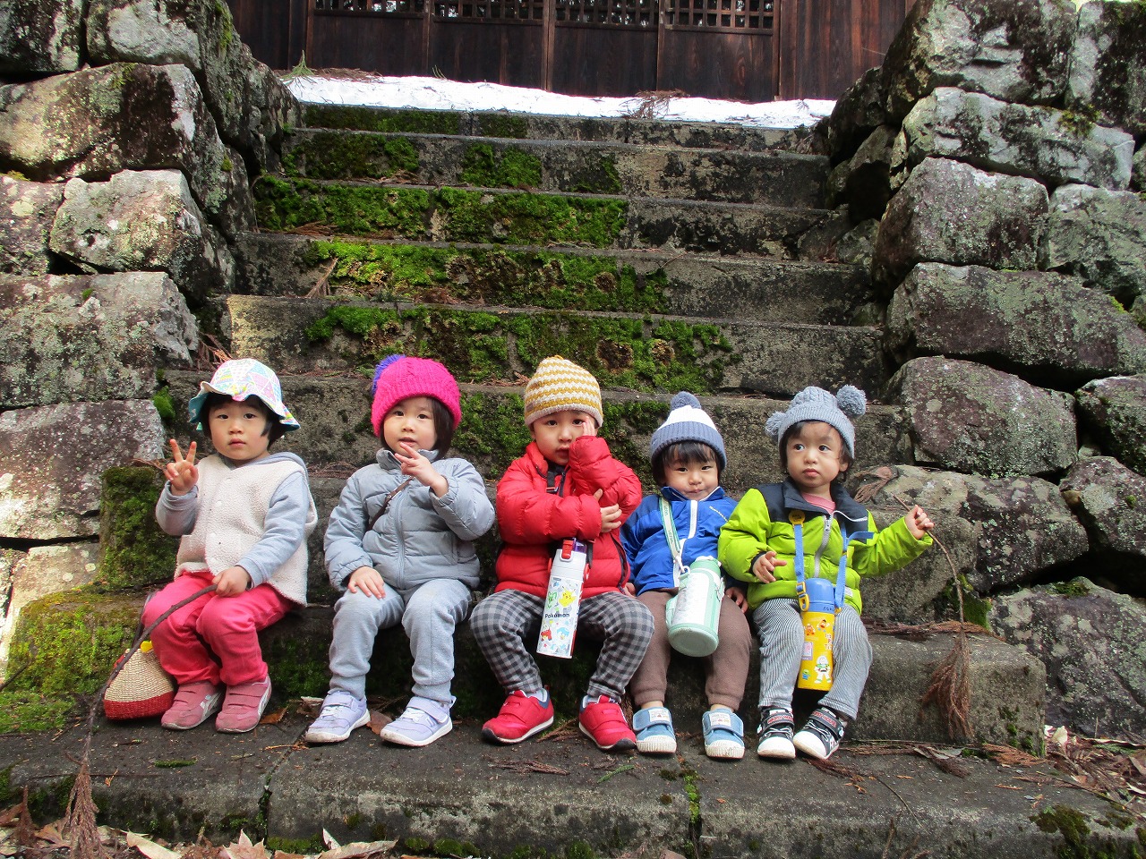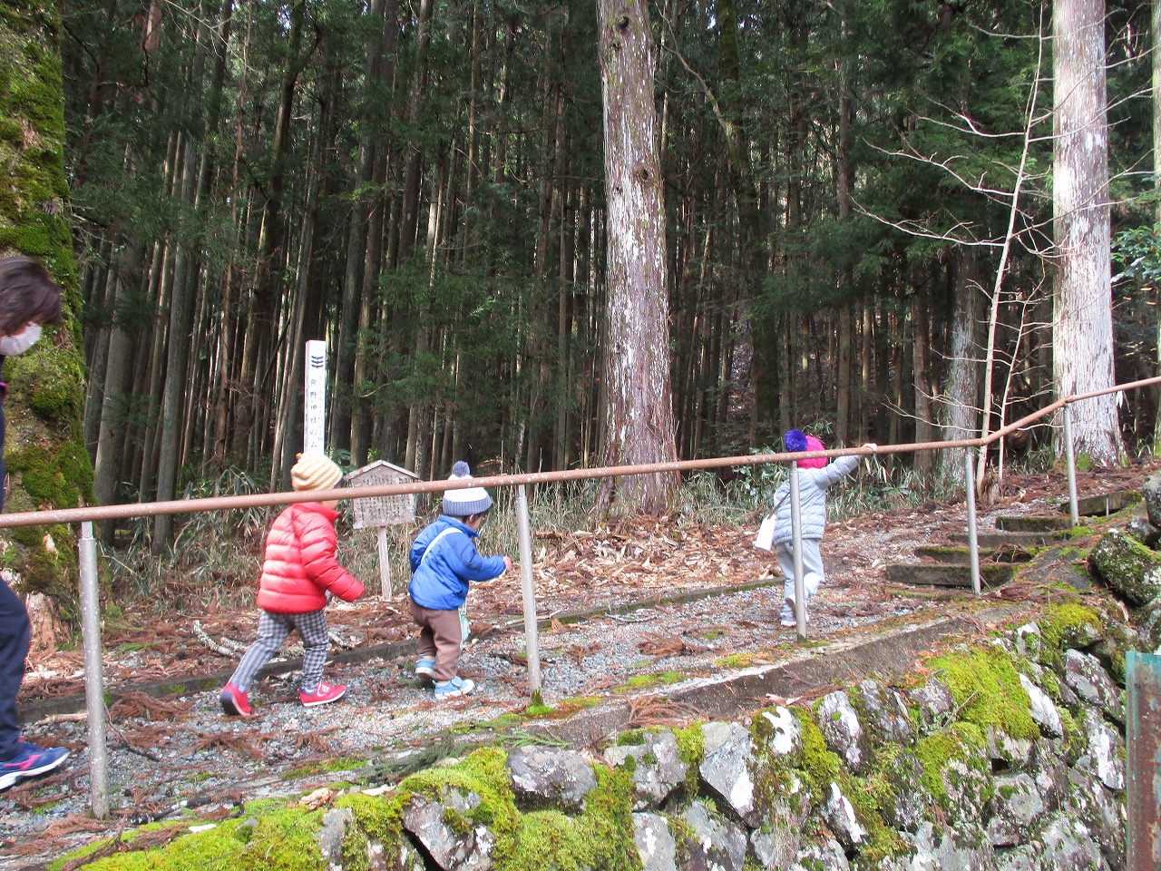 熊野神社へ思い出散歩に行って来ました。今年度4人のメンバーで出かける最後の散歩です!山道を上がったり、神殿の中を見たりして神社を探索して遊んできました。秋に来た時は歩くのも時間がかかったのにみんなで列になってスタスタと歩けるようになったね!あいかわらず、神社の狛犬は怖かったね!思い出いっぱいの散歩になりました。