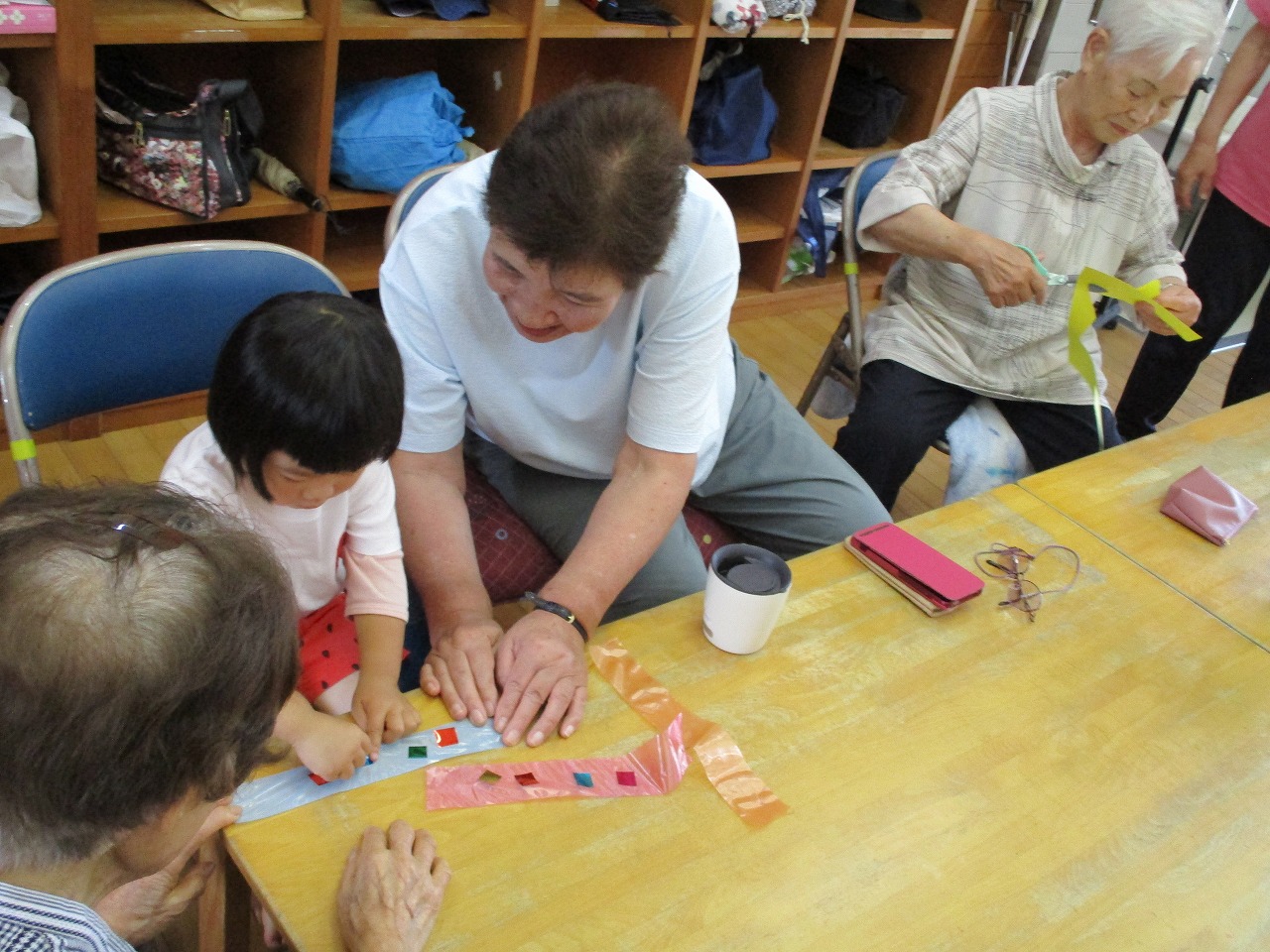 わかあゆもほのぼの館も6月生まれはいませんでしたのでお楽しみ会をしました。もうすぐ七夕なのでおじいちゃんおばあちゃんと七夕飾りを作りました。おじいちゃんおばあちゃんに手伝ってもらいながらキラキラの流れ星を作りました。おじいちゃんおばあちゃんと仲良く製作できました!