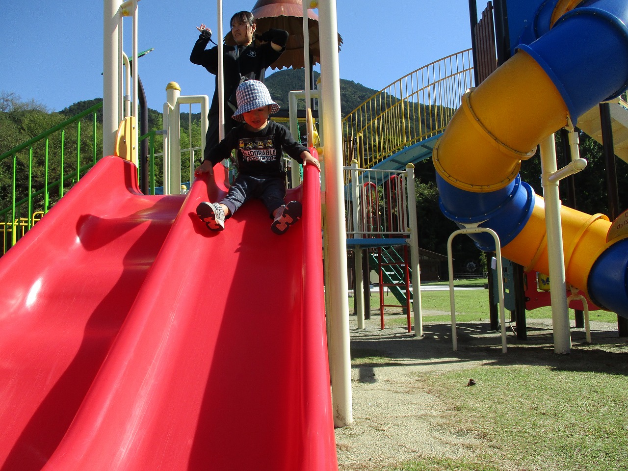 良い天気となり、バスに乗って飛騨川公園へ!始めに公園内を散歩するとどんぐりがいっぱい落ちていたのにこどもたちは全く興味がなく…いつもと違う景色に「アッ!」と反応したり芝生の坂道を走ったりして大はしゃぎでした。公園の職員の方のご厚意でバッテリーカーにも乗せてもらい、たくさんの遊具でいっぱい遊んで大喜びでした!そして待ちに待ったお弁当!!公園の木陰でニコニコして食べる表情がとっても可愛らしかったです♡帰りのバスは大型バス!疲れたけれど楽しい遠足になりました。