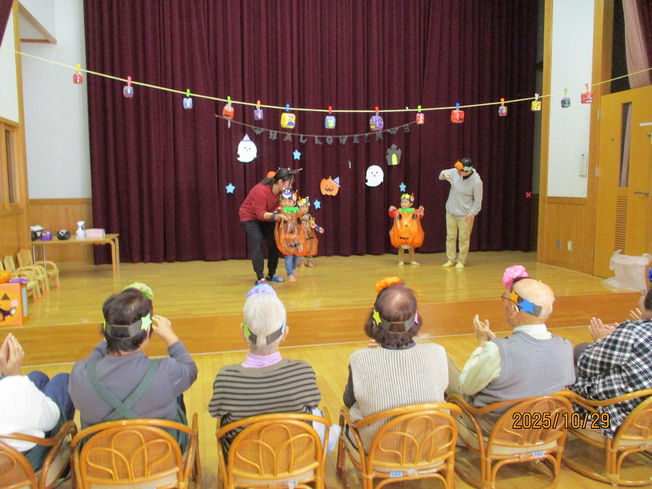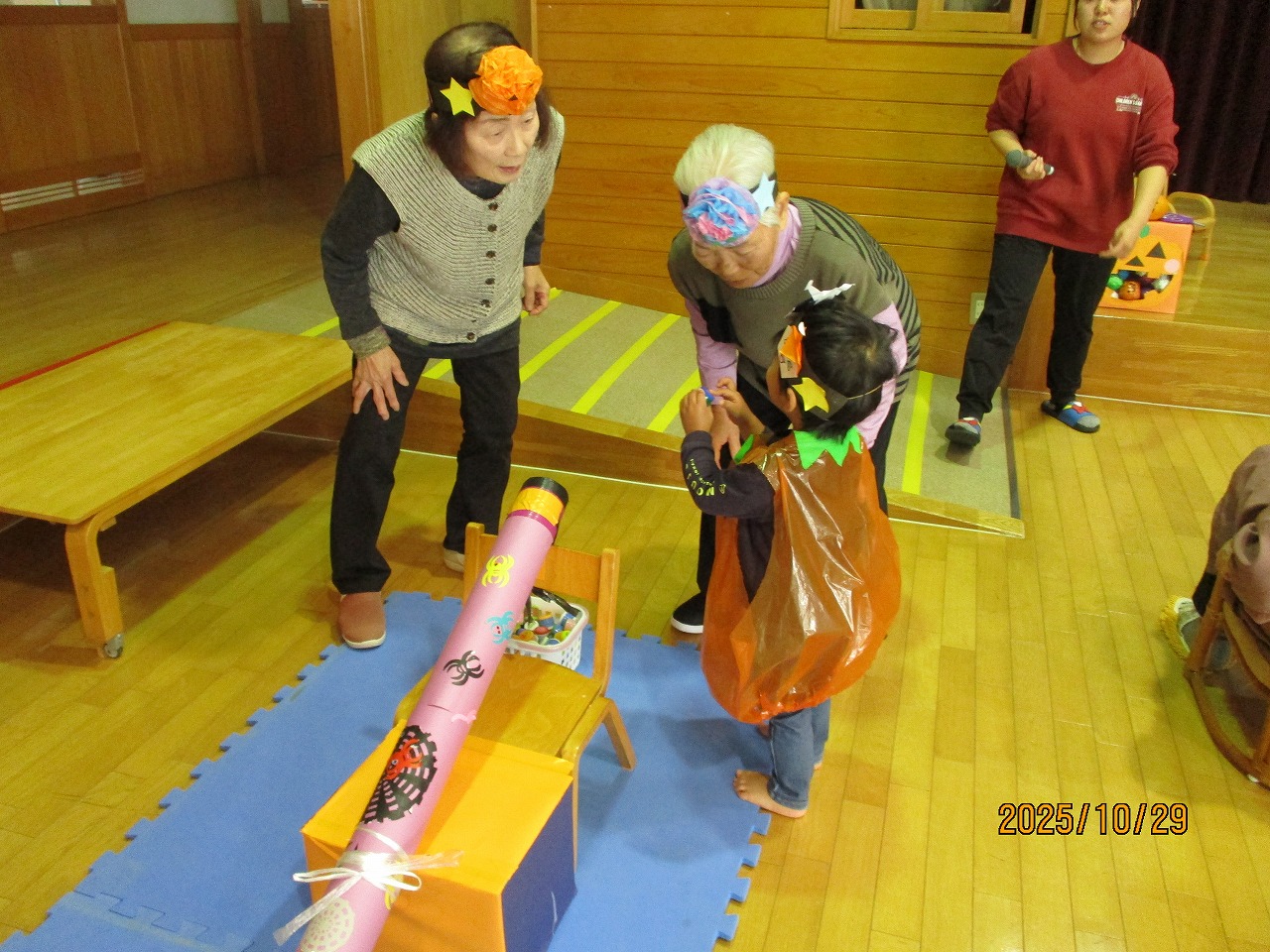 ほのぼの館の方とハロウィンパーティーをしました。子どもたちはかわいいかぼちゃになって「ハッピハッピハロウィーン」のダンスを踊りました♬おばあちゃんたちも一緒に踊ったね!グループになってハロウィーンゲーム(コロコロ転がし・的当て・サーキット)をして最後はにこにこ農園で育てたポップコーンを食べました!にぎやかなパーティーになりました!