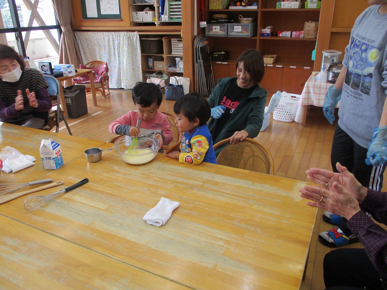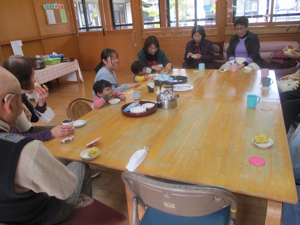 にこにこ農園で育てたさつま芋が10月にたくさん収穫できました。その芋をを使ってほのぼの館の方とケーキを作りました。卵や牛乳を入れたり混ぜたりしてみんなで協力してクッキングをしました。生地を炊飯器に入れて炊くとホカホカのさつま芋ケーキができあがり!!おばあちゃんたちに「おいしい〜」と喜んでもらえて楽しいクッキングになりました。
