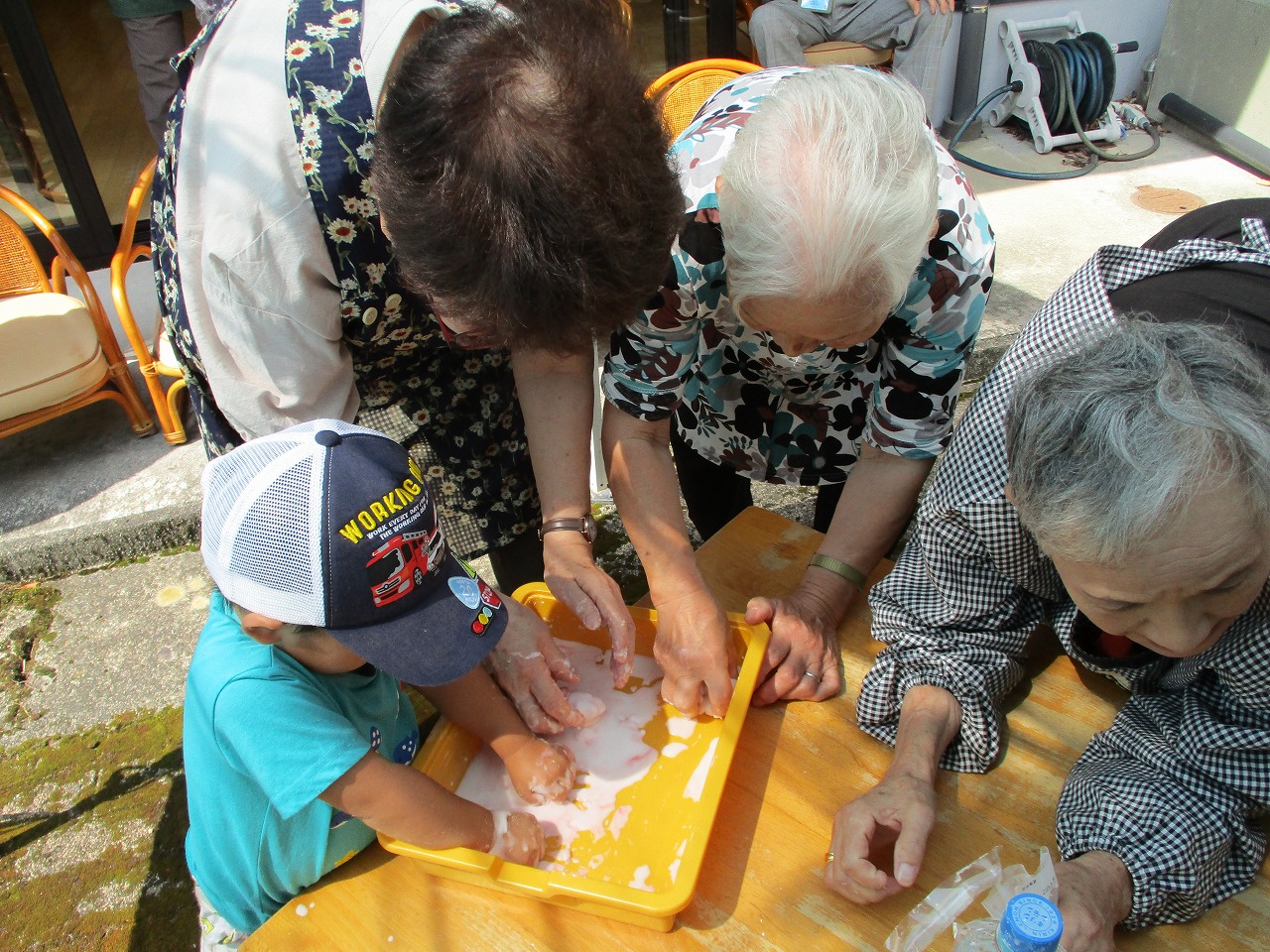 にこにこ農園で育てたさつま芋が10月にたくさん収穫できました。その芋をを使ってほのぼの館の方とケーキを作りました。卵や牛乳を入れたり混ぜたりしてみんなで協力してクッキングをしました。生地を炊飯器に入れて炊くとホカホカのさつま芋ケーキができあがり!!おばあちゃんたちに「おいしい〜」と喜んでもらえて楽しいクッキングになりました。 |