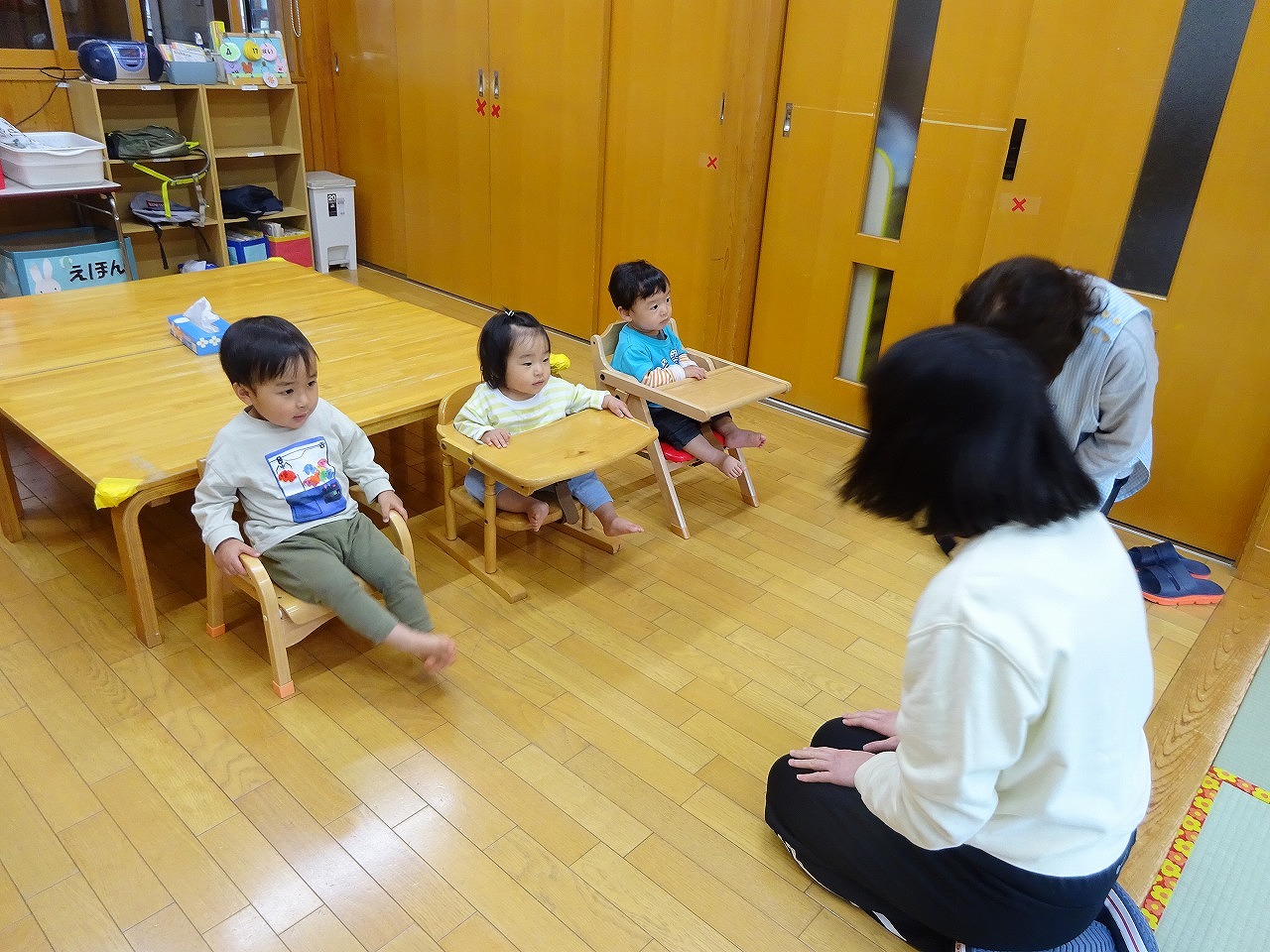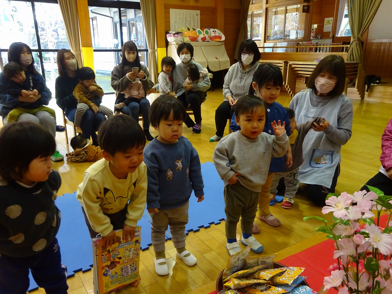 1.友だち紹介 2.プレゼント渡し 3.手あそび 4.大型絵本「ぴょーん」 5.ほのぼの館に行こう |