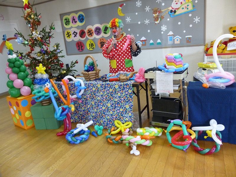トッチーさんのバルーンアートショーはとても素敵でした。 新潟にトナカイとソリーを忘れてきた慌てん坊のサンタさんは、萩原のトナカイと一緒に子どもたちにプレゼントを届けました。