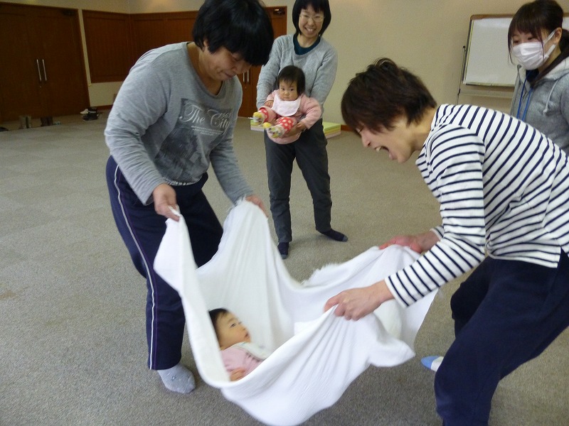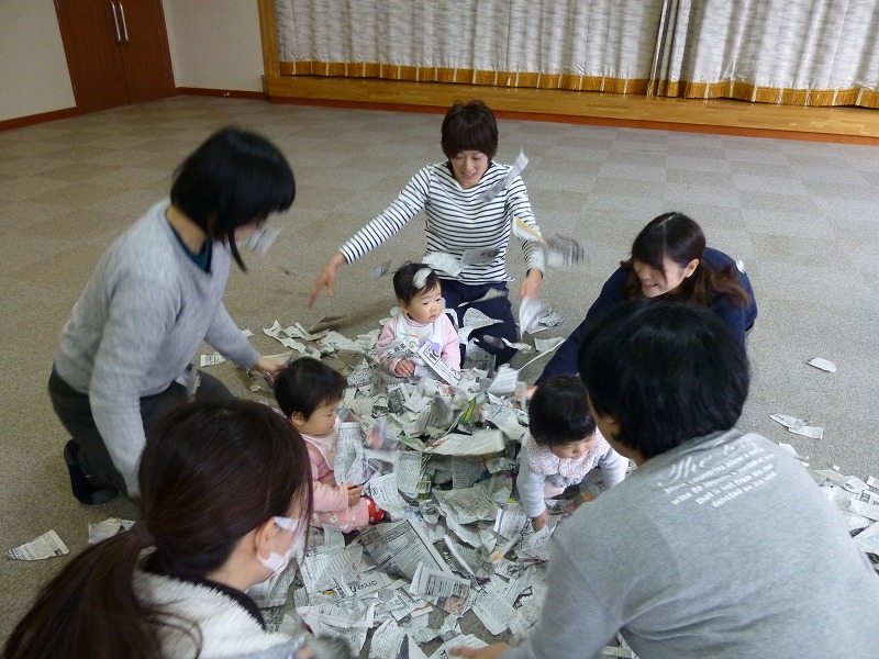 9ケ月〜1歳3ケ月の小さな子どもたちに合わせた体操になりました。 新聞紙をビリビリにしてシャワーのように子どもたちに降りかけるととても喜びました。 ストレス解消のように新聞紙をビリビリにするお母さんたちも嬉しそうでした。