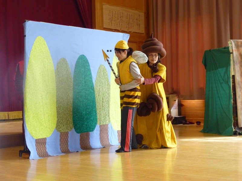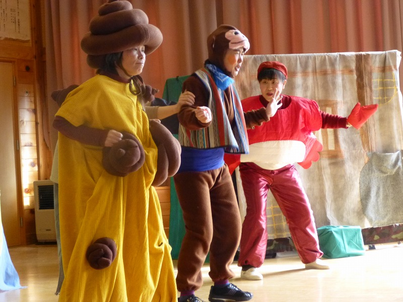 劇団「くるりんぱ」さんによる「さるかにばなし」を北保育園・北医院ししの子・北部乳幼児学級等の皆さんと一緒に見ました。 劇の途中で流行りのギャグがたくさん出てきて大笑い! 最後に、北児童館のさやか先生はかわいいハチさんになって出演し、おさるさんのお尻めがけて「ち〜く〜!」と針で刺しました。