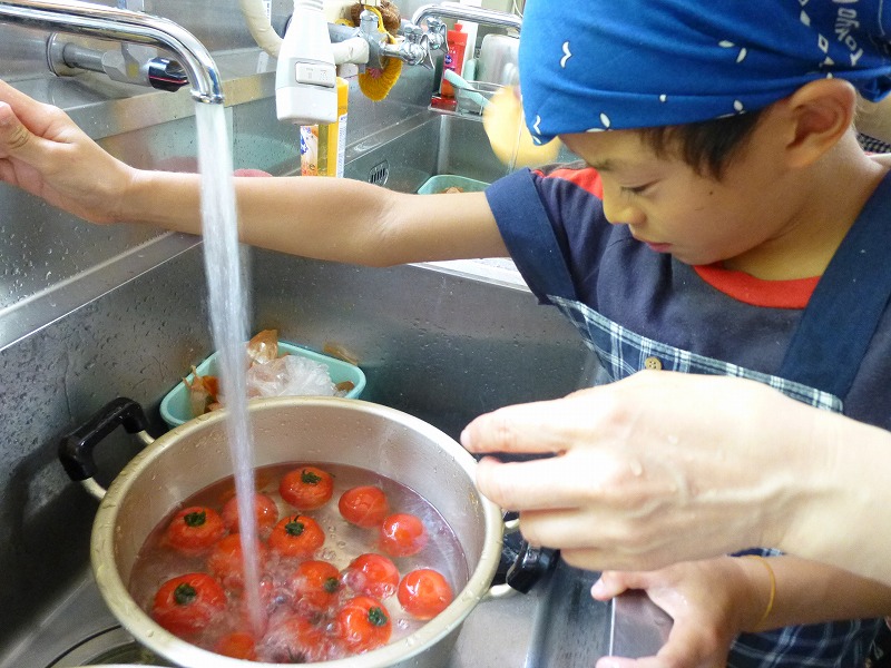 ひよっこ農園で採れたじゃがいもを使ってクッキングをしました。 「スコップコロッケ・デリサラダ・ビシソワーズ・ポテトチップス」のメニューに小学生と乳幼児親子たちがチャレンジしました。 じゃがいもの皮をむいていちょう切りにしたり、茹でたいもを潰したりしておいしい料理が出来上がりました。