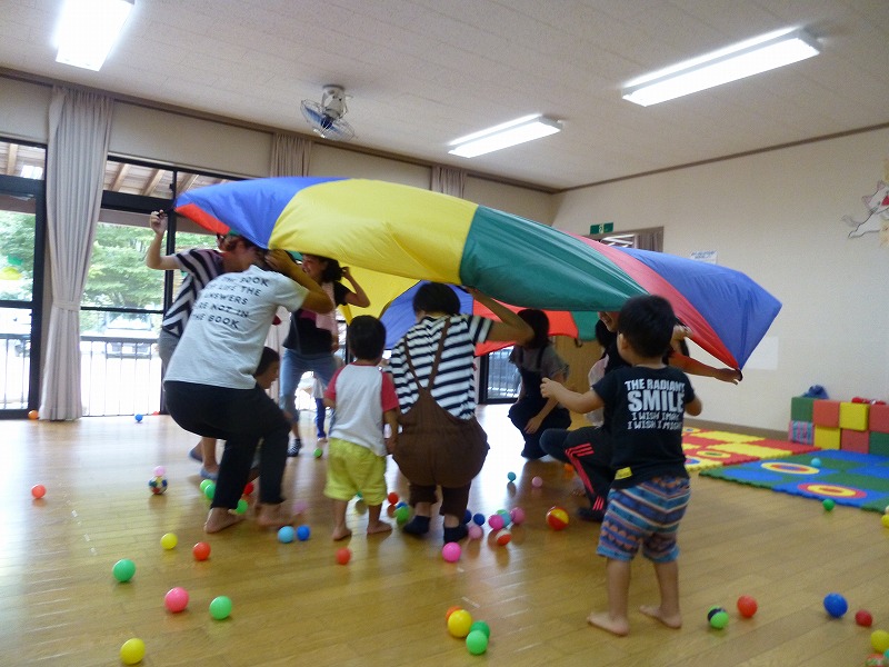 講師:小池淳子先生 7組の親子が身近にあるものを使って親子のふれあい遊びを楽しみました。 タオルを使ってひっぱり合いをしたり、ボールのように丸めて投げたりしました。 大きな広がるバル―ンを使ってカラーボールの雨を降らせると、子どもたちは大喜びしました。 最後にマットを使って転がったり、でんぐり返しをしたりして汗びっしょりになりました。