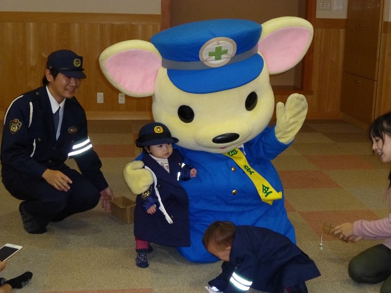 北部合同乳幼児学級と小坂乳幼児学級が合同で交通安全教室を行いました。 警察の方と交通安全協会の方に協力していただき、実際に横断歩道を歩いたり、シートベルトの着用を呼びかけたビデオを見たりしました。 また、警察キャラクターのこあんちゃんが登場すると会場は盛り上がりました。 ちびっこ警官の制服を着た子どもたちは、こあんちゃんと一緒に記念写真を撮りました。