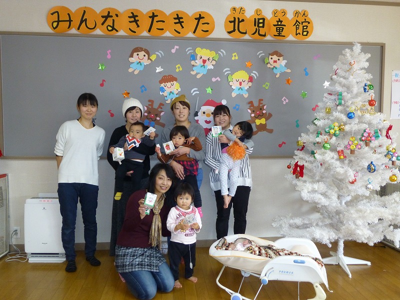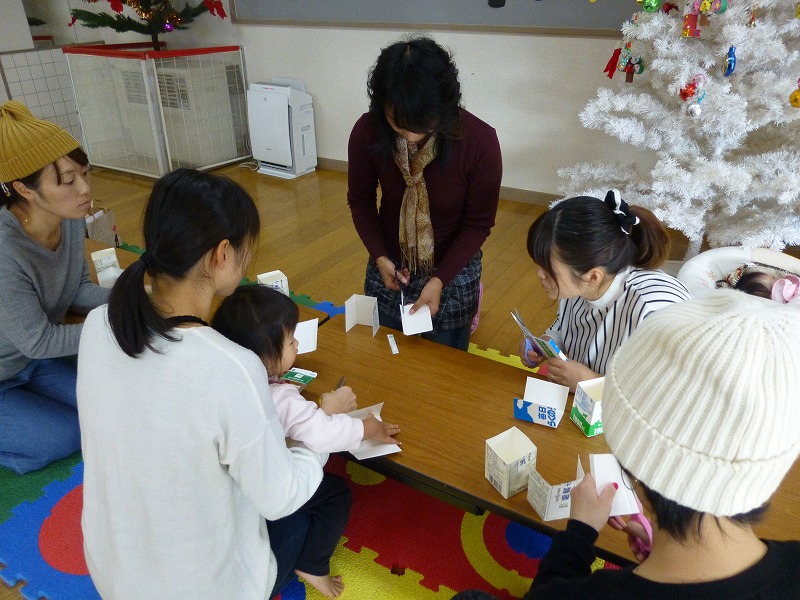 伊藤葉子さんの「ママのリフレシュ体操」に4組の親子が参加し、体をほぐしました。 気持ちよく体がほぐれたところで、牛乳パックを使って簡単にできるおもちゃを教えていただきました。 ひもを引っ張ると一瞬で絵が変わるので、子どもたちは大喜びしました。