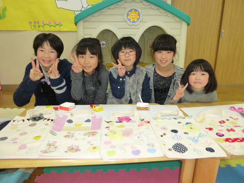 講師:小池香織先生(北児童館)&熊崎美恵子さん 25名の小学生が、キャンバス生地のトートバッグに、はぎれやスタンプを使って自由にデコレーションしました。 最後にレースやボタンで飾り付けをして、世界に一つしかない作品ができました。