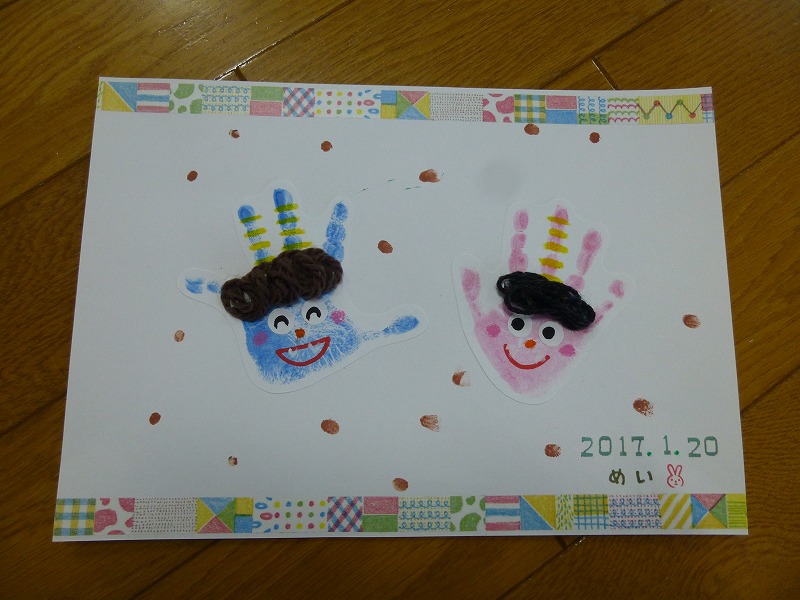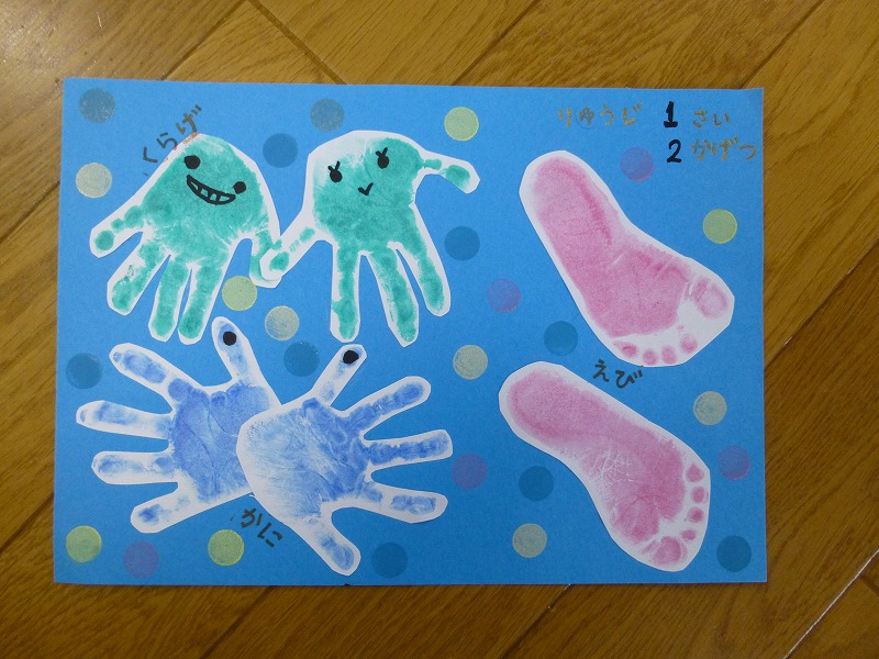 児童館で身長体重測定をした後、保健師さんから生活リズムを整えるためのポイントを聞きました。 引き続き、「手形アート」にチャレンジし、子どもの手形・足形をさまざまなモチーフに見立てたアート作品を作りました。