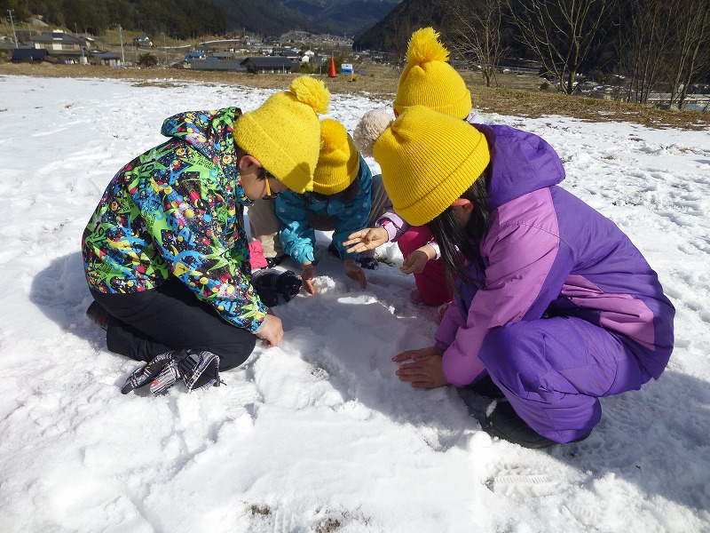 講師:小池明聖さん きたこども園の年長さんが明聖先生といしょに「冬みつけ」をしました。 最初、森に住む動物の足跡を探しました。かわいい足跡の正体はハクビシンでした。 次に南天の実と葉を使って雪うさぎをつくったり、雪の塔の高さを競ったりしました。 園児たちは夢中になって雪と遊びました。
