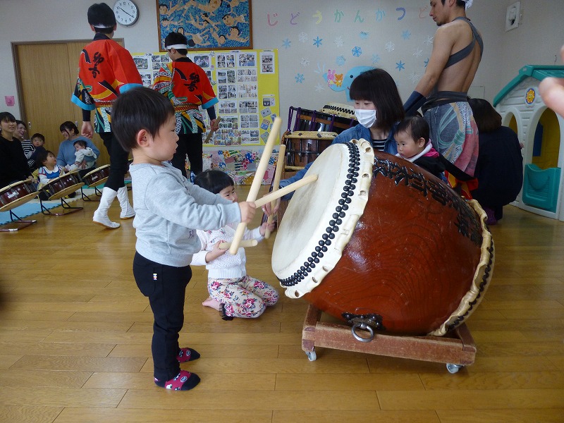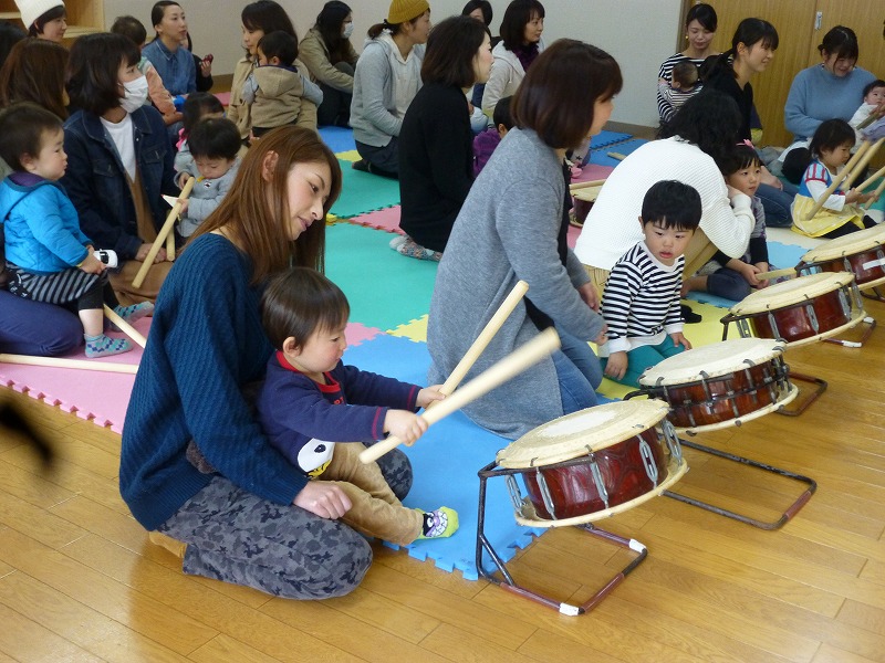 今年度活動してきた乳幼児学級が閉級式を迎えました。 「御前太鼓保存会」のみなさんによる迫力ある太鼓の演奏を間近で聞いたので、子どもたちは圧倒されていました。 子どもたちも一緒に太鼓をたたく時間をいただいたので、とても喜んでいました。 アンコール曲「祝い太鼓」の演奏に親子は釘づけでした。 御前太鼓保存会の皆さん、ありがとうございました。