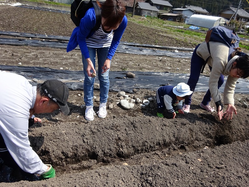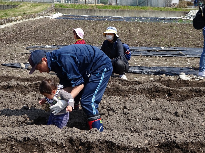 12組の親子が種イモを半分に切り、灰をつけてから50センチ間隔に植えて土をかぶせました。 「植えるところから参加できて良かったです。」「子どもが土遊びできるので嬉しいです。」という感想をいただきました。 「ひよっこ農園・たまごクラブ会員」随時募集!