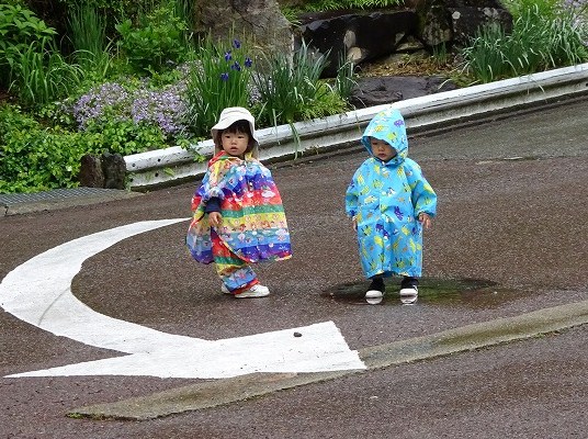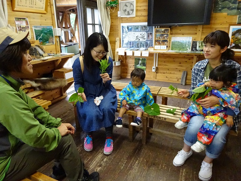 「小坂200滝ガイド」皆越真佐代さんと一緒に新緑を楽しむ予定でしたが、雨が降ってしまいました。 公園内にある小屋で、ガイドさんが事前に摘んできた、ふき・いたどり・よもぎ等に触れながら、美味しい食べ方を習いました。 かっぱを着ている子どもたちは、雨にも負けず水たまり遊びを始めました。