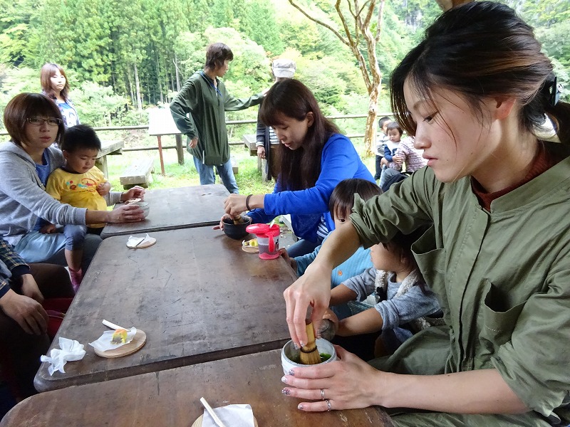 巌立を小坂200滝ガイド皆越真佐代さんと一緒に散策した後、豊かな自然の中で14組の親子が野点を楽しみました。