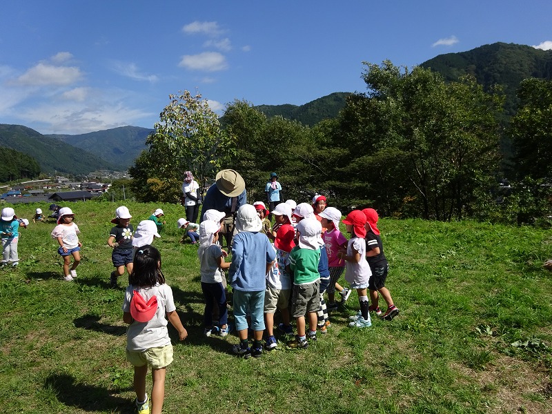 高原の森で伊藤栄一先生(隊長)による森のなりわい講座があり、乳幼児親子ときたこども園の園児らが参加しました。