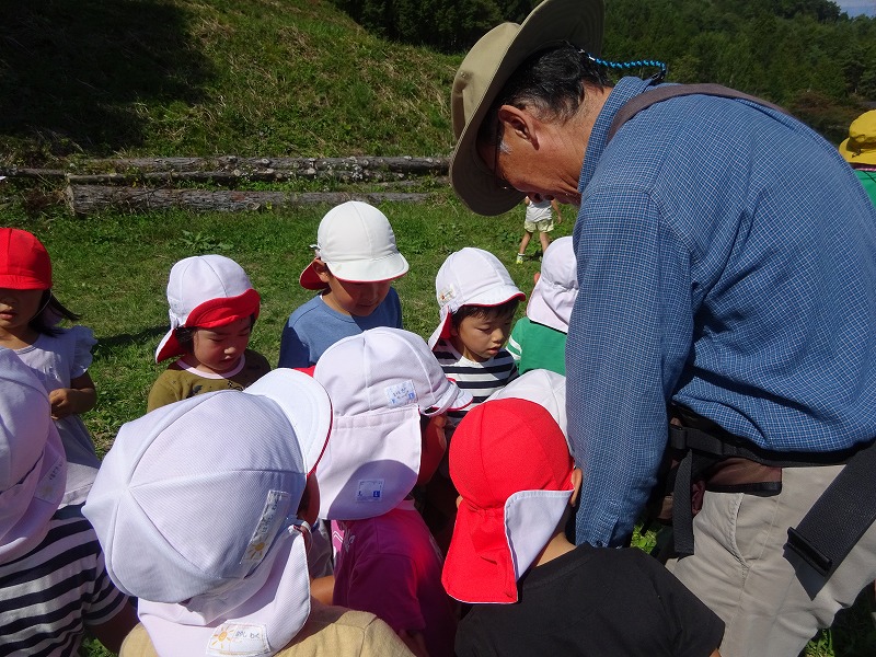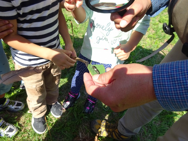 隊長は森の中にいる特に危ない生き物として蜂を挙げ、「じっとしていれば刺されないこと、刺された時は素早くポイズンリムーバーという大きなスポイドを使って毒を出してから病院へ行くこと」を教えてくれました。 子どもたちは、昆虫や幼虫・植物を見つけて観察したり、触れ合ったりして楽しい時間を森で過ごしました。