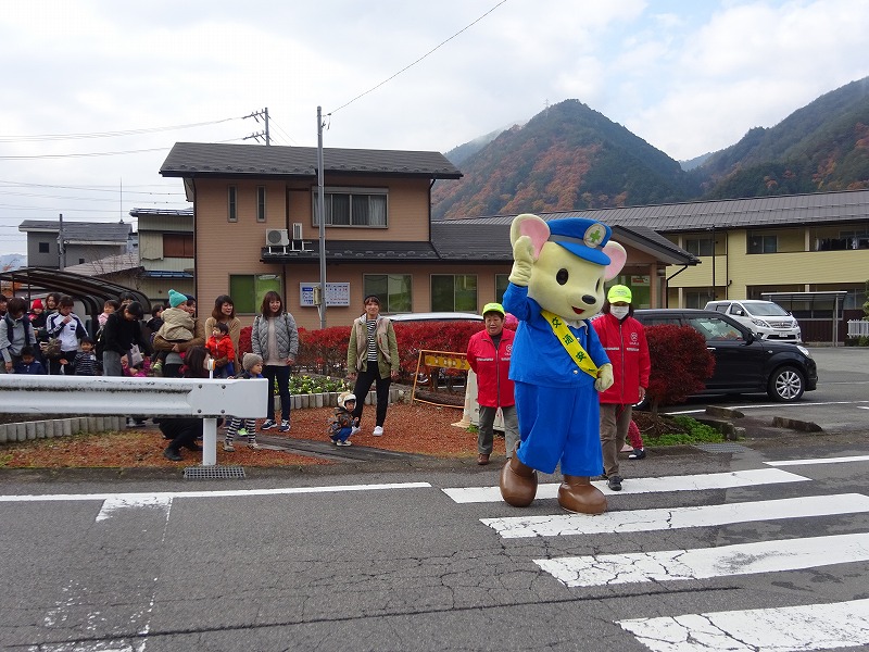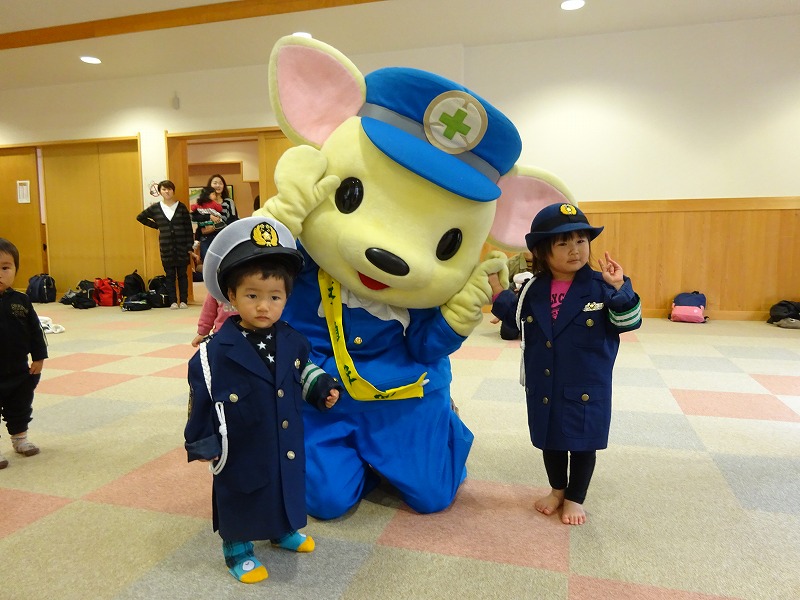 警察と交通安全協会の方に協力していただき、実際に横断歩道を歩いたり、交通安全の講話を聞いたりしました。 警察キャラクターのこあんちゃんも登場し、ちびっこ警官の制服を着た子どもたちと一緒に記念撮影。 警察の方から、来年はチャイルドシート体験車に乗ってみようという提案がありました。
