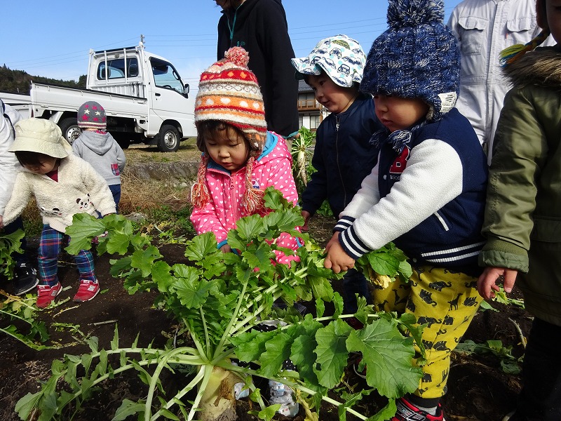 7組の親子と「ししのこ」の園児が大根の収穫を楽しみました。