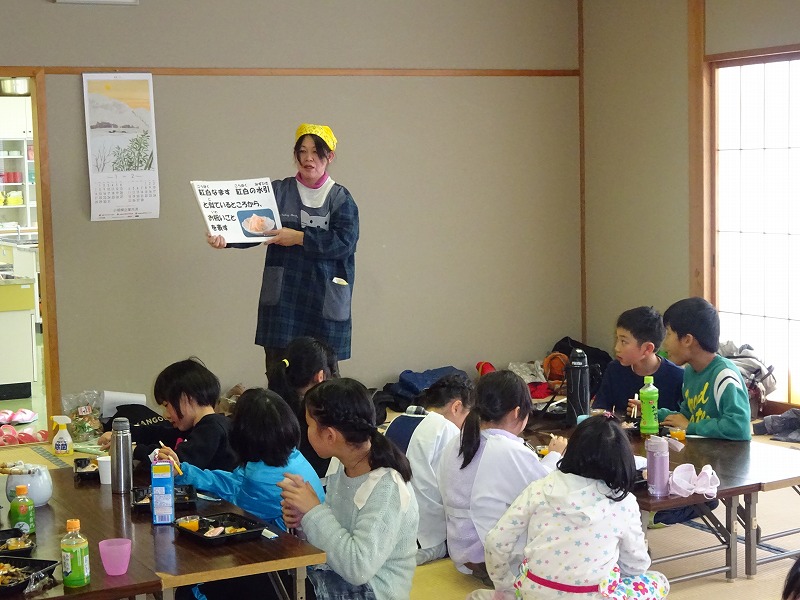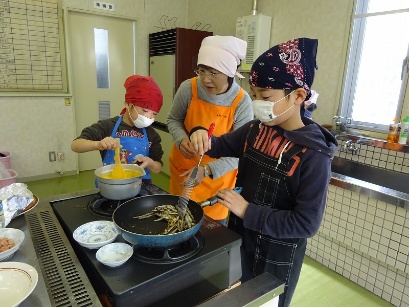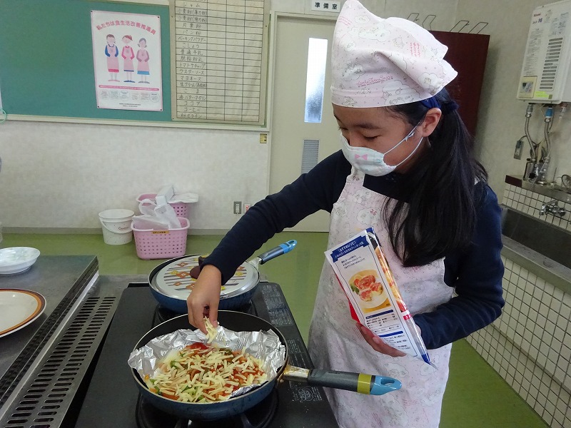 正月料理と言っても子どもたちが食べやすいように応用した「餅ピザ・干し柿のチーズとハム巻き・くるみ入り田作り・みかんゼリー」です。 各グループで手分けして手際よく作れました。また、食べながらおせち料理の由来やその中身の意味を紙芝居にして聞いてもらいました。