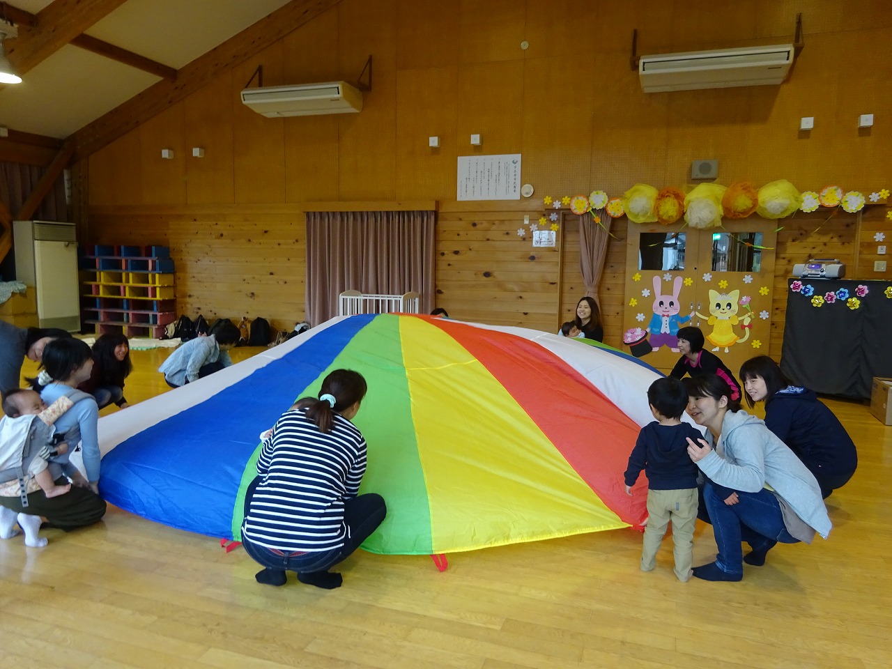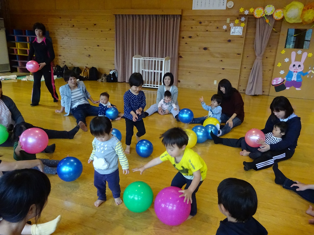 サーキット遊び・ボール遊び・タオルハンモック・音楽に合わせて踊りました。 その中でも大きなバルーンの中に子どもたちをに閉じ込めると「キャー」と言って大喜び。 普段の遊びの中に今日の体験を活かせるといいですね。