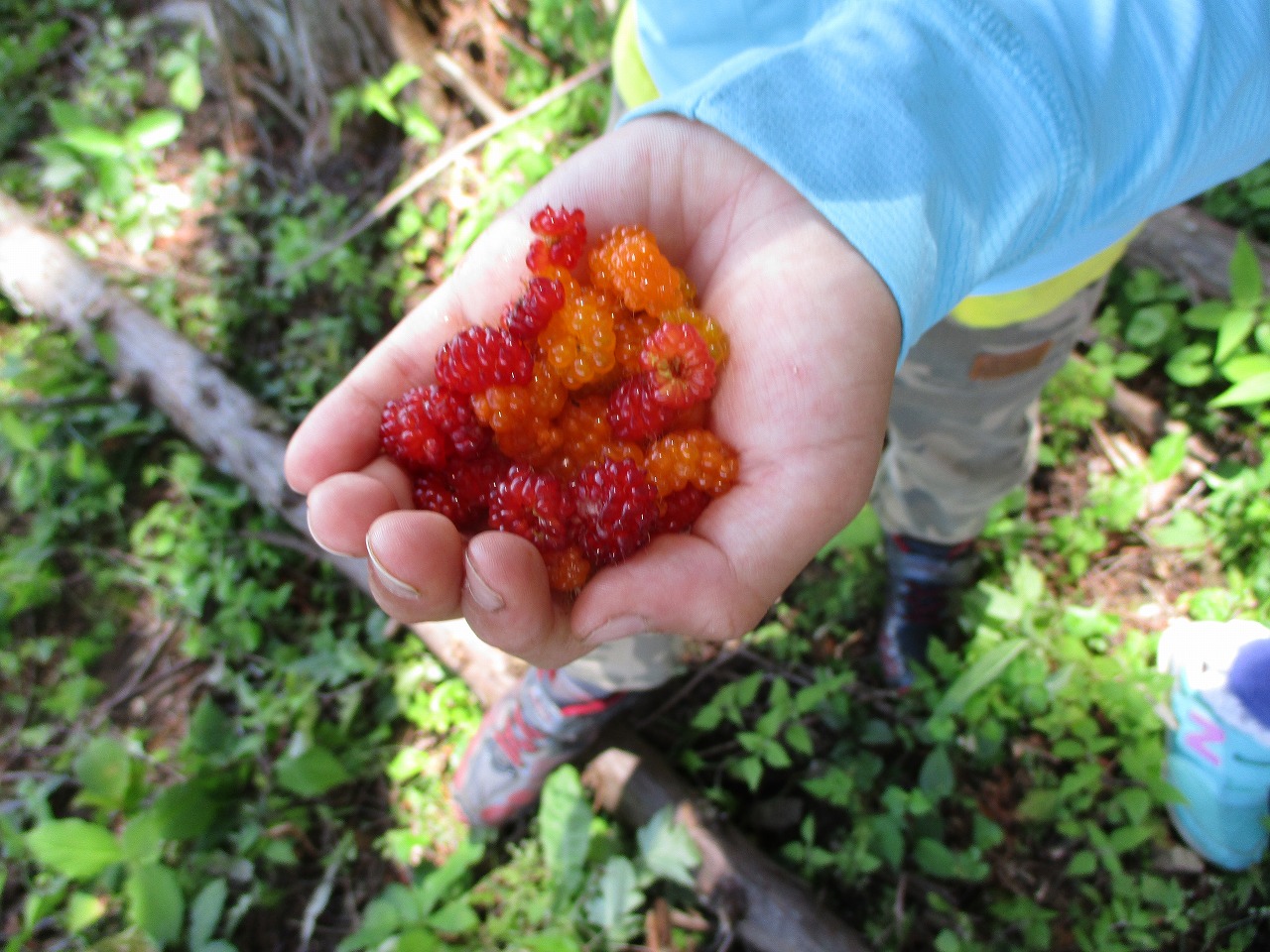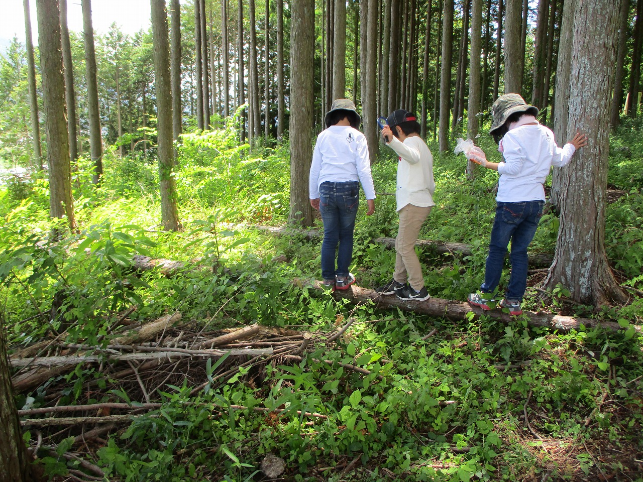 ハンモックでゆらゆら揺れながら森林浴。 笹の葉・タンポポで草笛を吹いたり、野いちごを食べたりしました。 バランスをとりながら丸太の上を歩きました。