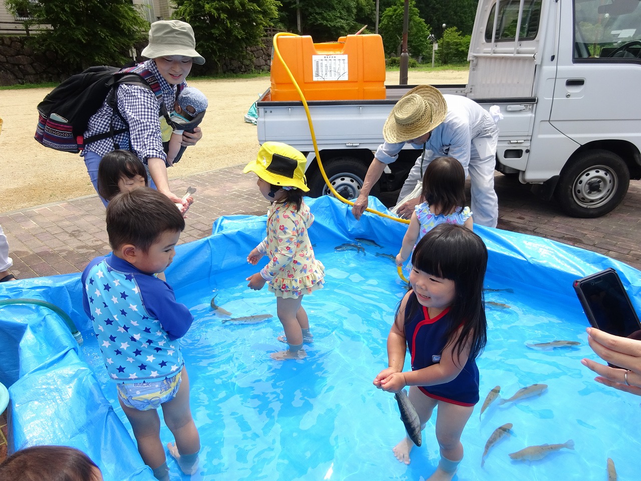 親子で、ピザづくりと魚のつかみどりを楽しみました。