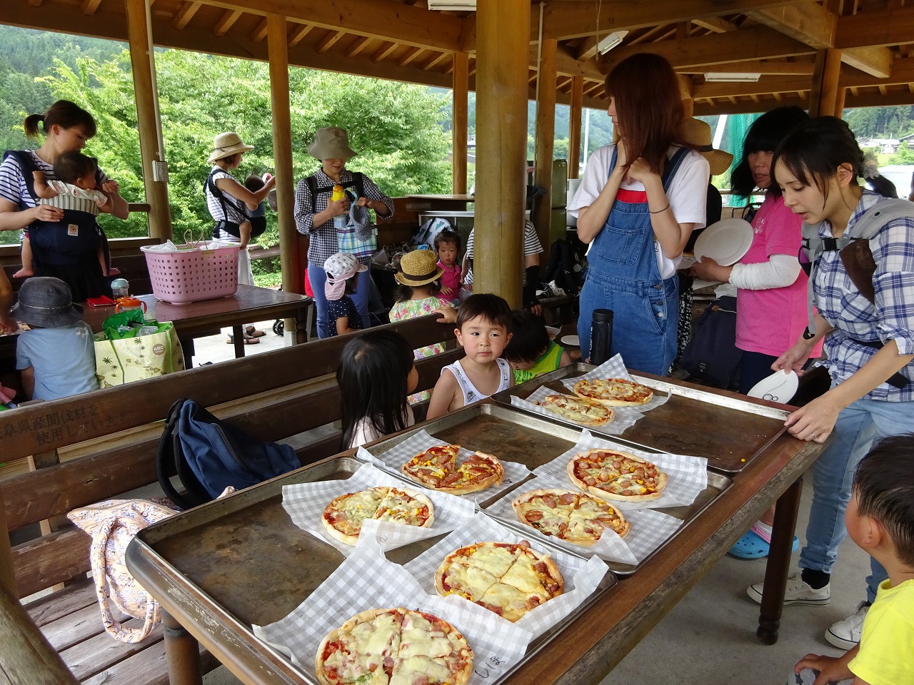 活きのいいマスを子どもたちは、必死で追いかけて捕まえたけど、スルッと手から滑り落ちていました。 ボリュームたっぷりのピザと炭火でじっくりと焼きあげたマスを食べてお腹いっぱいになりました。
