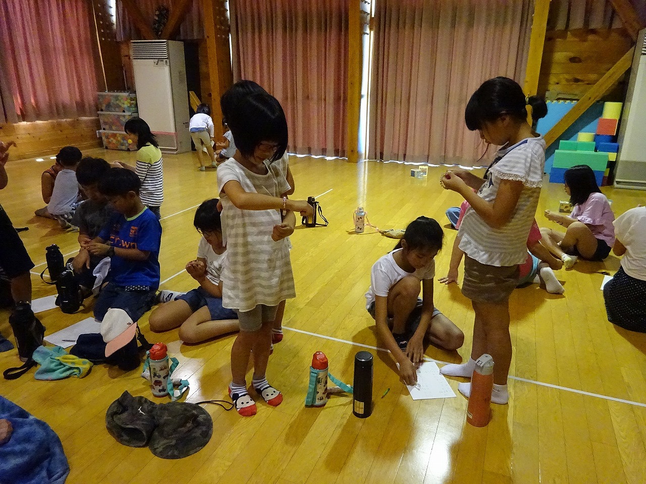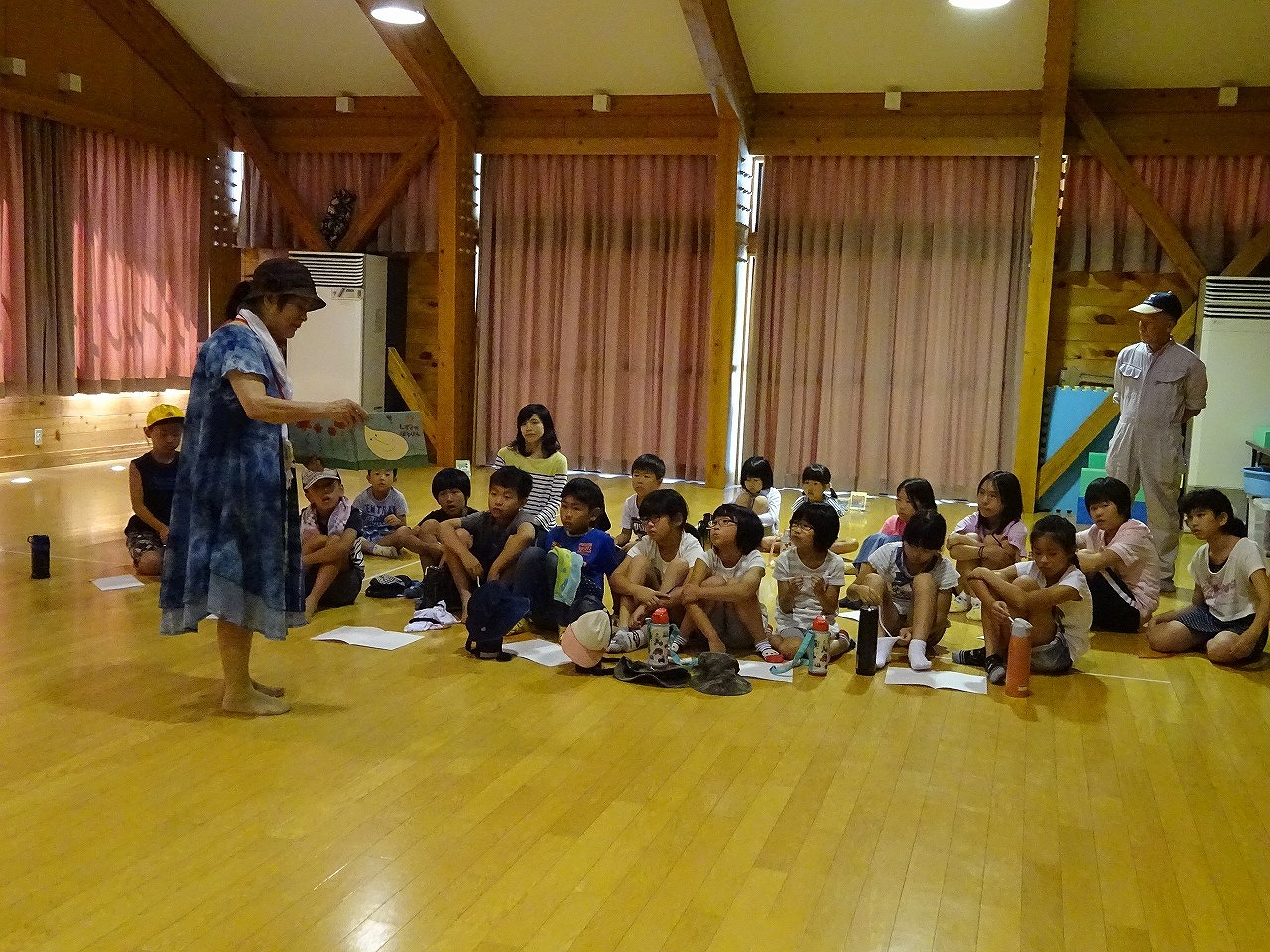 「地球温暖化が進むと、健康被害・異常気象がおこり、気候の変化に対応できない動植物が絶滅してしまう。私たちができることは、電気・水の節約・洗剤やシャンプーを減らしていこう」と子どもたちに語ったのは、観察指導員の小池明聖さん。