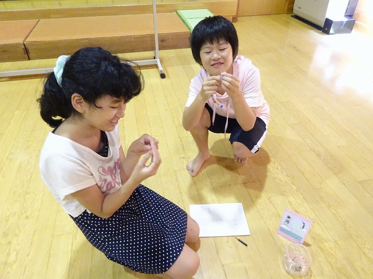 絵本「しずくの冒険」は、しずくが雲・雨・氷などに変化して冒険する話。その話しのしずくのように、子どもたちも地球のあらゆる水のある場所へサイコロで行き先を決めて冒険しながら、モールにビーズを通していきました。