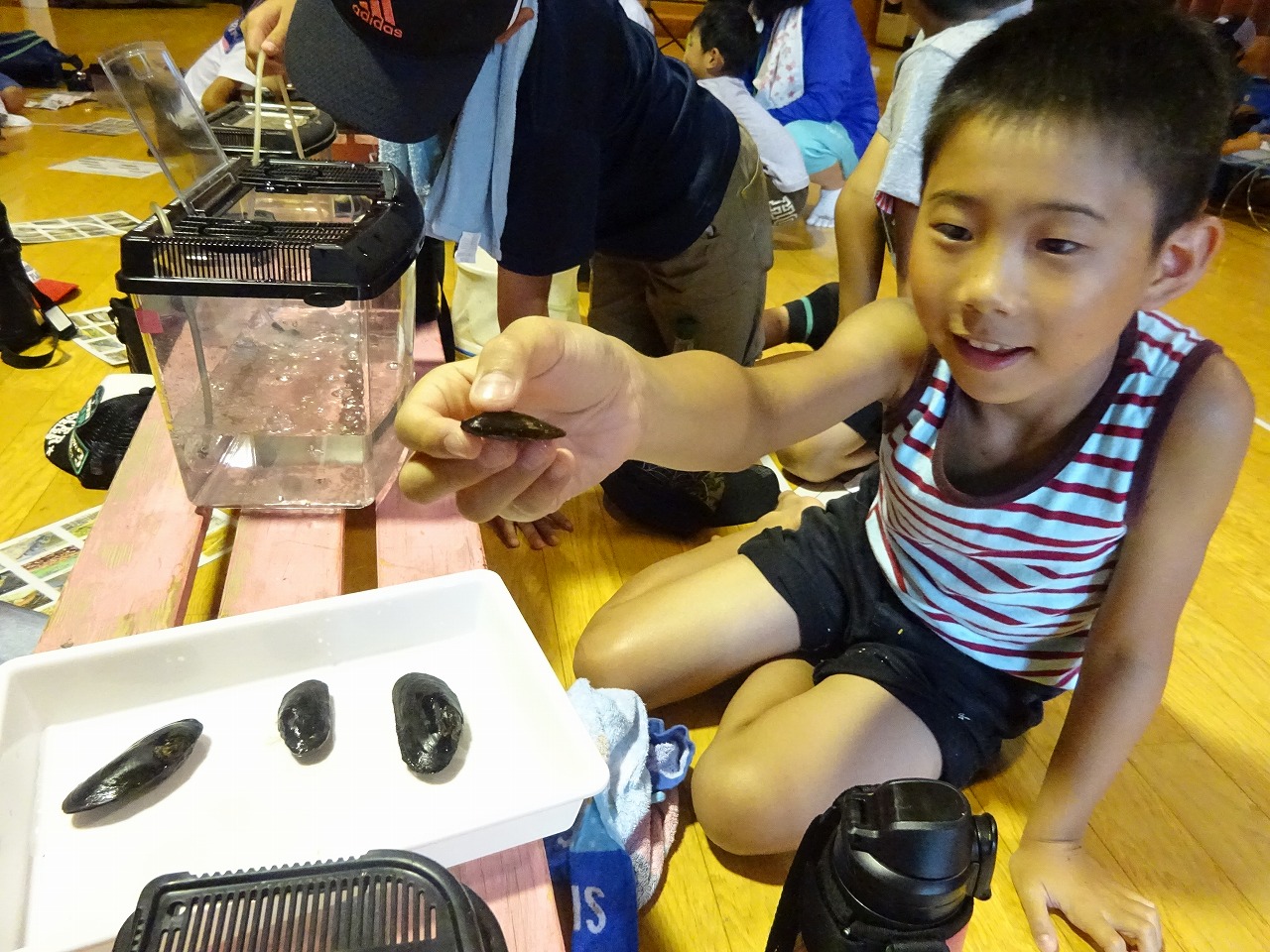 屋外調査後は、岸博士から川魚の見分け方と絶滅危惧種である「カワシンジュガイ」について詳しく学びました。