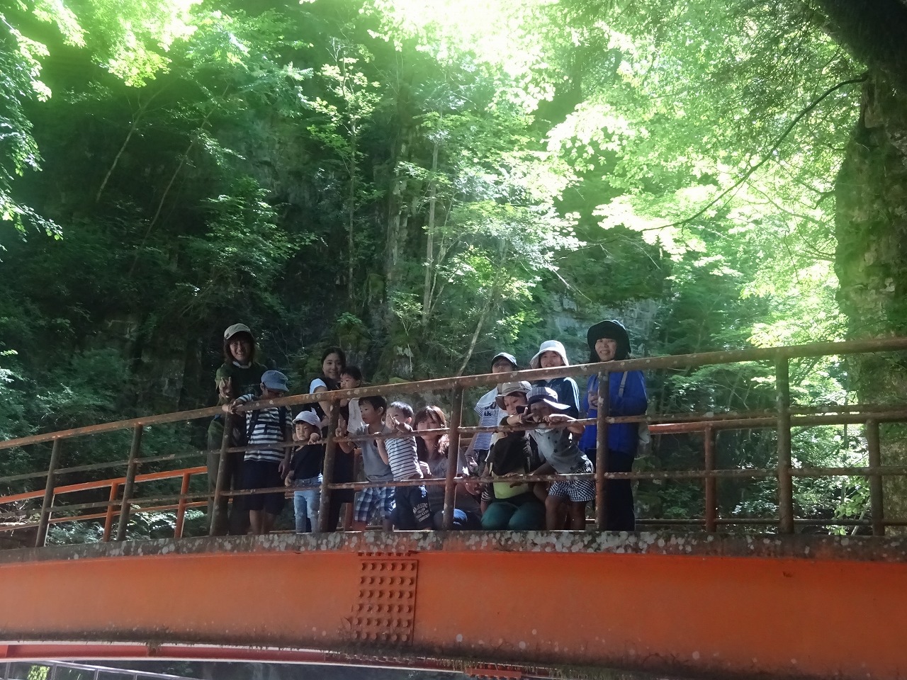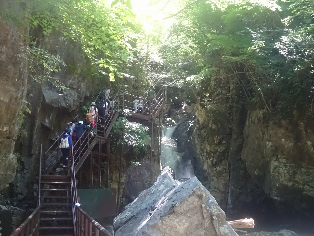 当初の予定では巌立公園の水辺で水遊びを計画していましたが、7月上旬の豪雨災害により、水辺へ降りることができなくなりました。 滝見遊歩道も大きな被害を受けていましたが、8月中旬に「三ツ滝」までは開通しました。 道中、流木が川岸まで上がっているのを目の当たりにし、あちこちに豪雨による爪痕が残っていました。