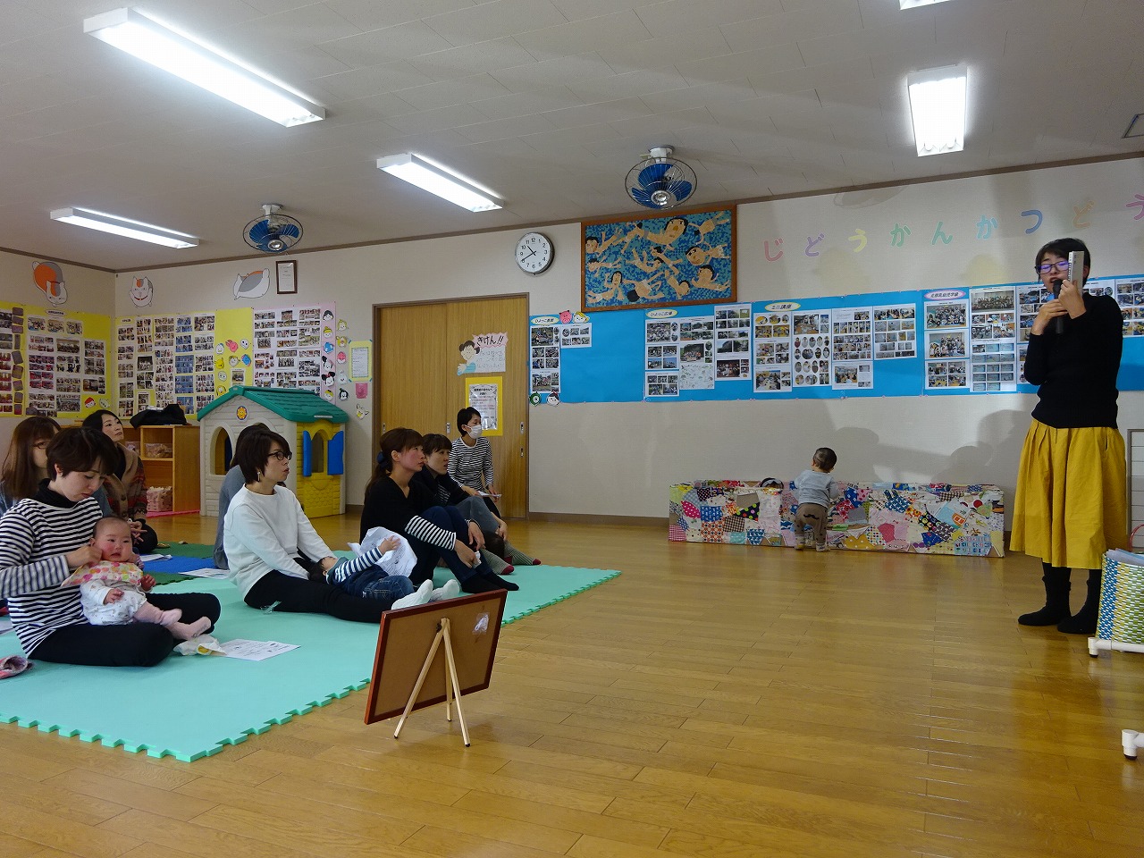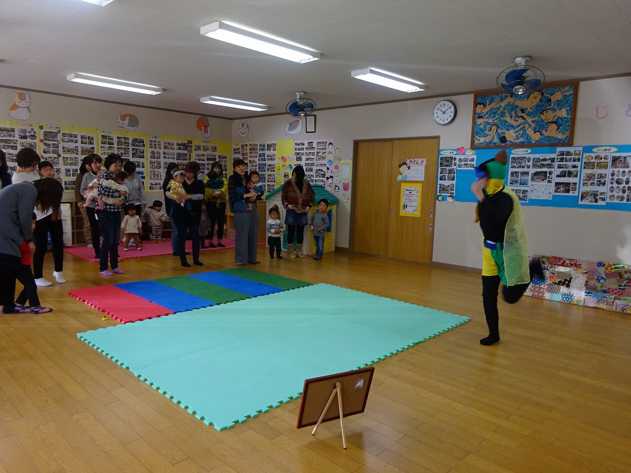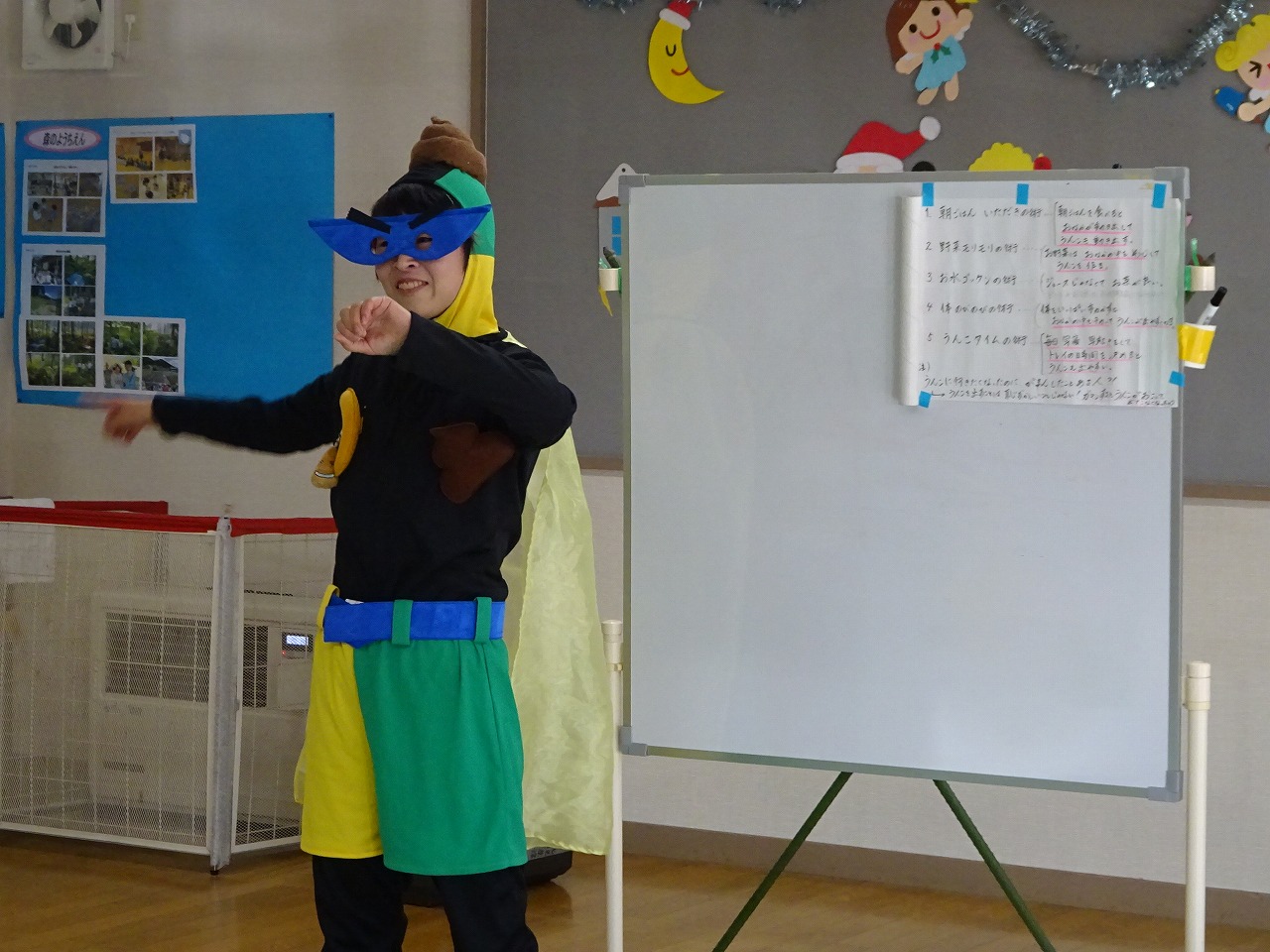 うんこダスマンが登場し、バランスのいい食生活を送る魔法の言葉「まごわやさしいこ」を教え、うんこダスマン体操を踊りました。 「味覚の幅が広がるには、乳幼児期に何を食べてきたかが重要。食事が楽しいと感じる環境。ポジティブなイメージを持たせる工夫をするのがいい。」と語りました。 今後も熊倉さんの「食品添加物のはなし」「お砂糖のはなし」「「安心安全な食べ物を選択するためのポイント」等の食育に関する講話を定期的に開催していく予定です。