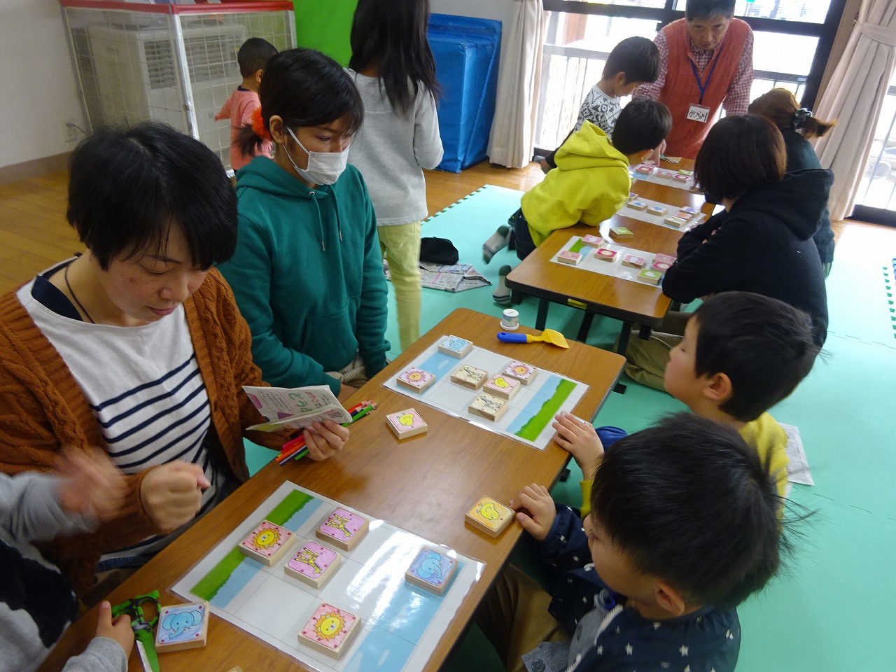 色とりどりの駒が出来上がると親子対戦が始まり、我が子の強さに驚くお母さんや、負けて泣く子どもの姿もみられました。 簡単なルールですが、奥が深いです。 「下呂市子育て支援事業・親学び講座」とのコラボ企画のおかげで、素敵などうぶつ将棋セットが完成しました。 家族のコミュニュケーションツールの一つとして活用して欲しいです。