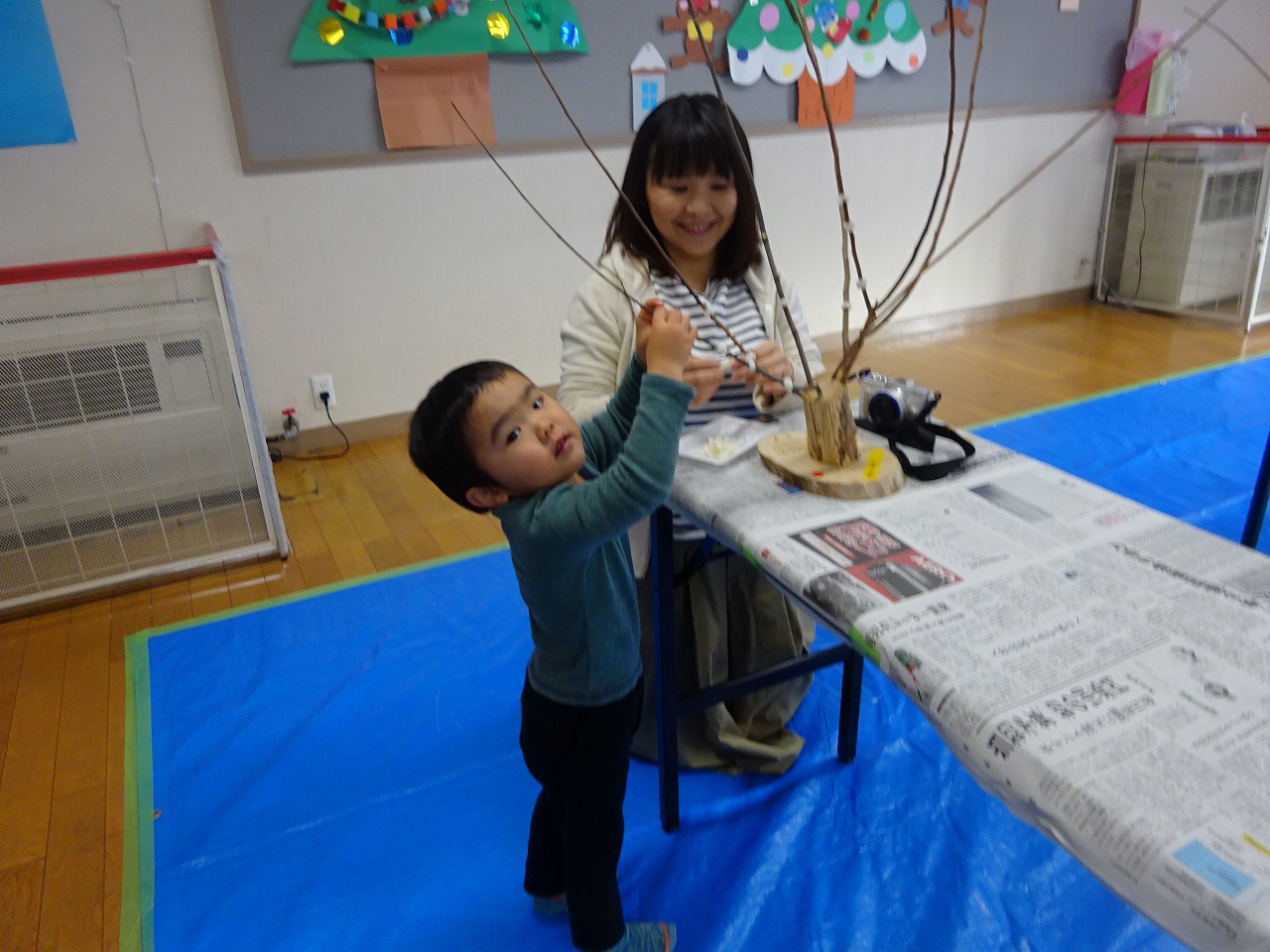 土台の切り株に挿してあるもみじの枝に、数珠玉にした白餅を7・5・3の間隔でつけ、その間に赤餅を一つ加えて、紅白の華やかな花もちに仕上げました。 他地域親子同士が交流しながら、飛騨地方の伝統文化に親しみました。