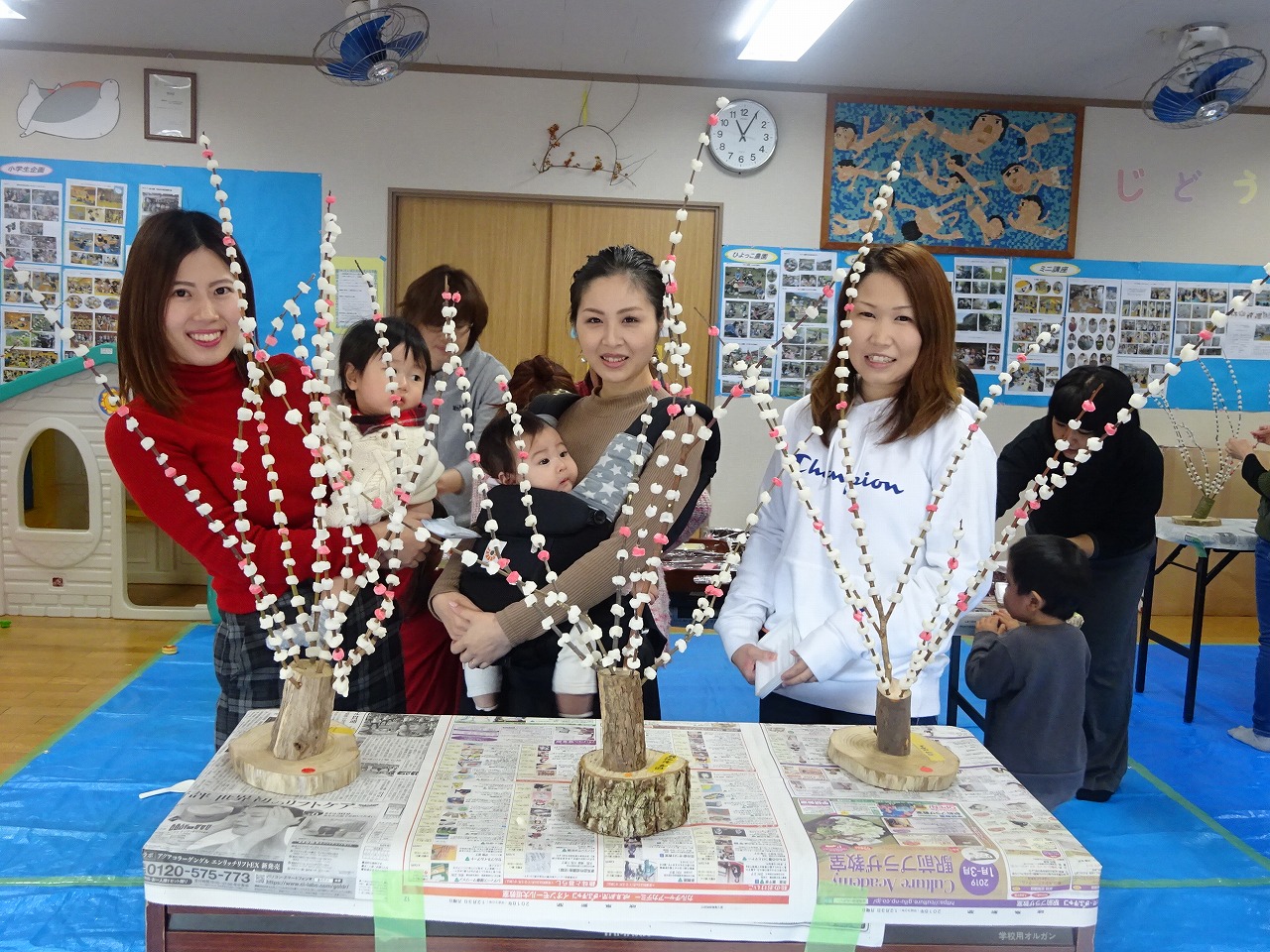 北部の子育て支援施設とのコラボ企画・飛騨の冬の風物詩「花もち飾り作り」に16組の親子が参加しました。