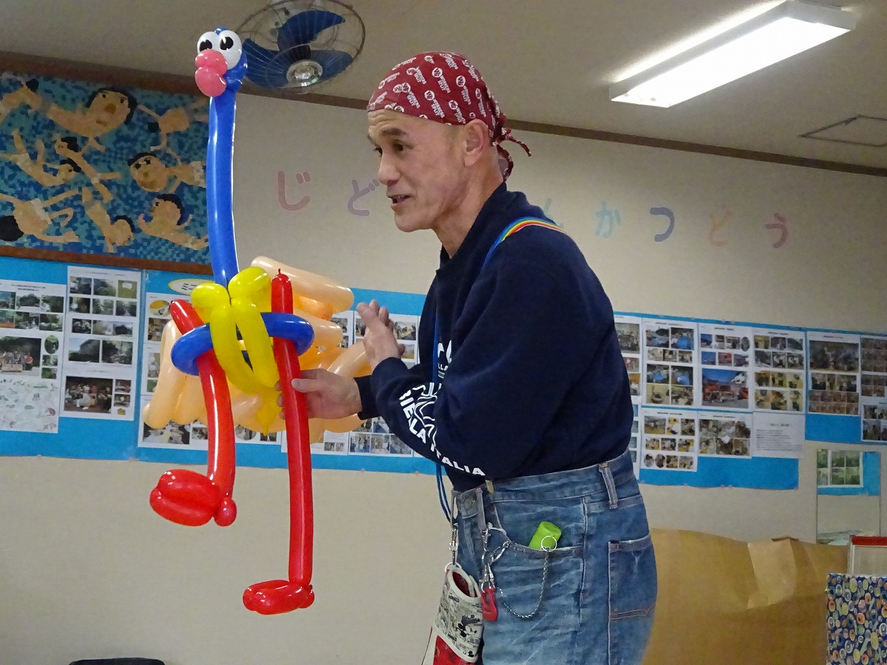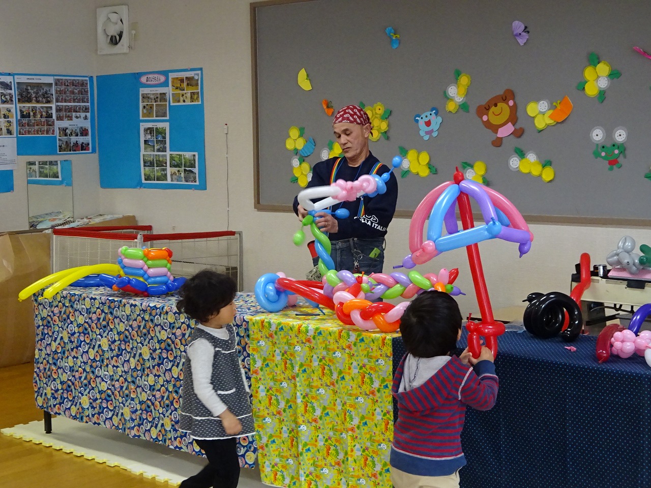 前半は、下呂市・市民活動推進課・社会教育主事横井先生の子育て講話を聞きました。 よくある「乳幼児の一人遊び・友だちと遊ばない・友だちとのトラブル」について、横井先生は「大丈夫!こころが成長している証です!」と様々なスチュエーションを交えて解りやすく話しました。 後半は、トッチーさんがバルーンで素敵な作品を仕上げていく様子を見て楽しみました。
