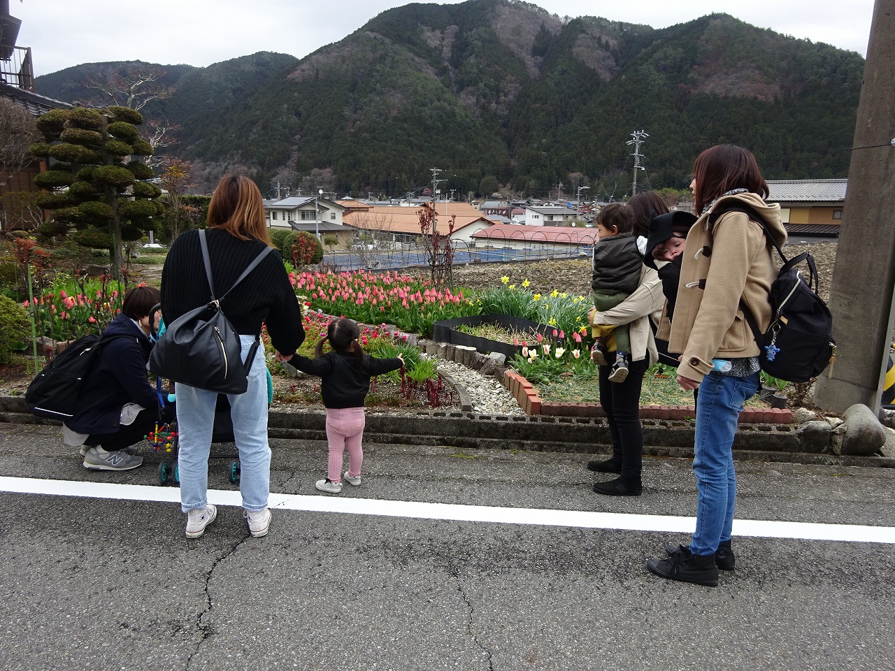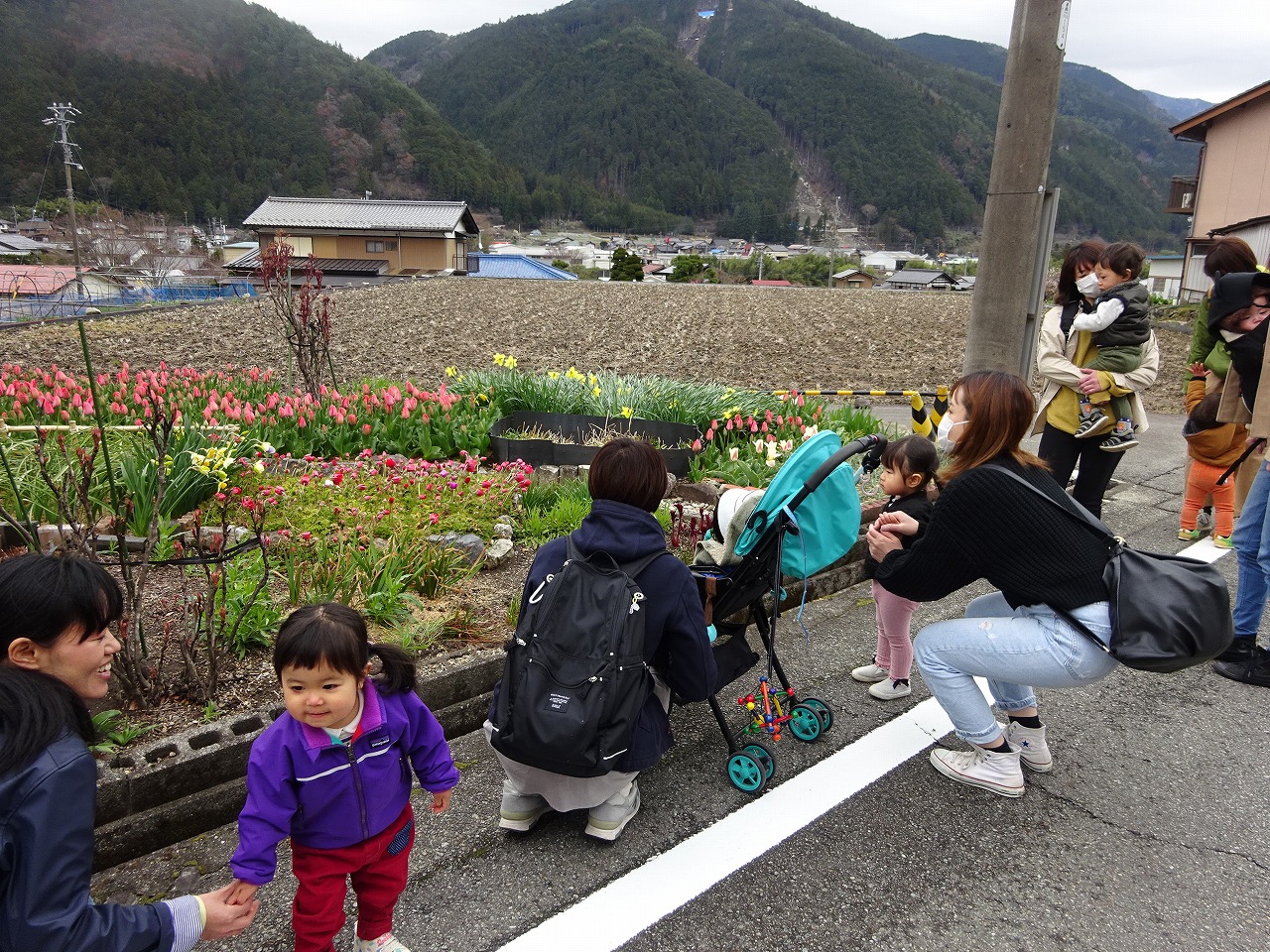 歩きながら桜や桃の花を見たり、畑一面のチュウリップを見たりして「きれい」と話していました。