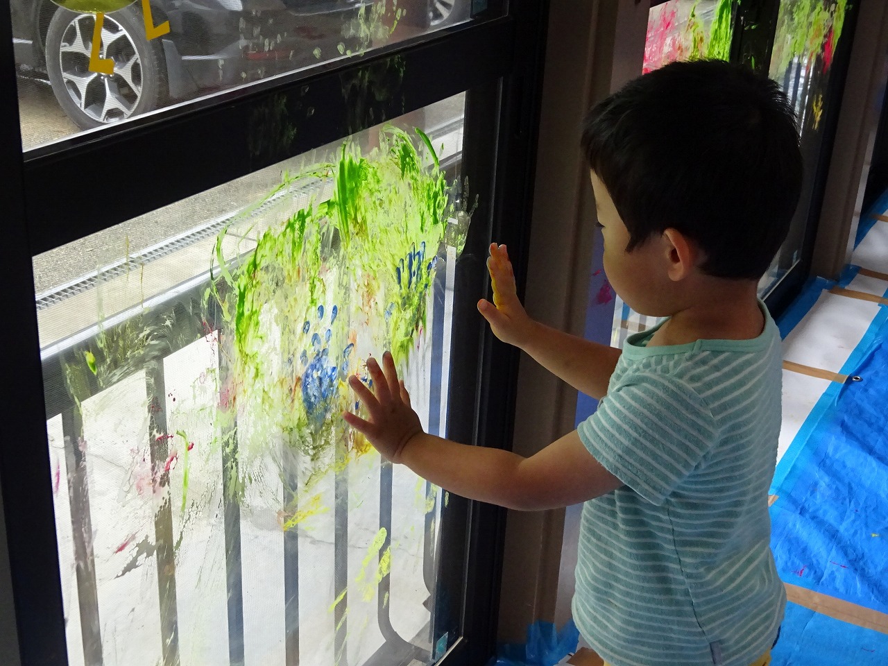床一面に大きく敷いた紙や窓ガラス・自分の体やママの服に、自由に絵具を塗りました。