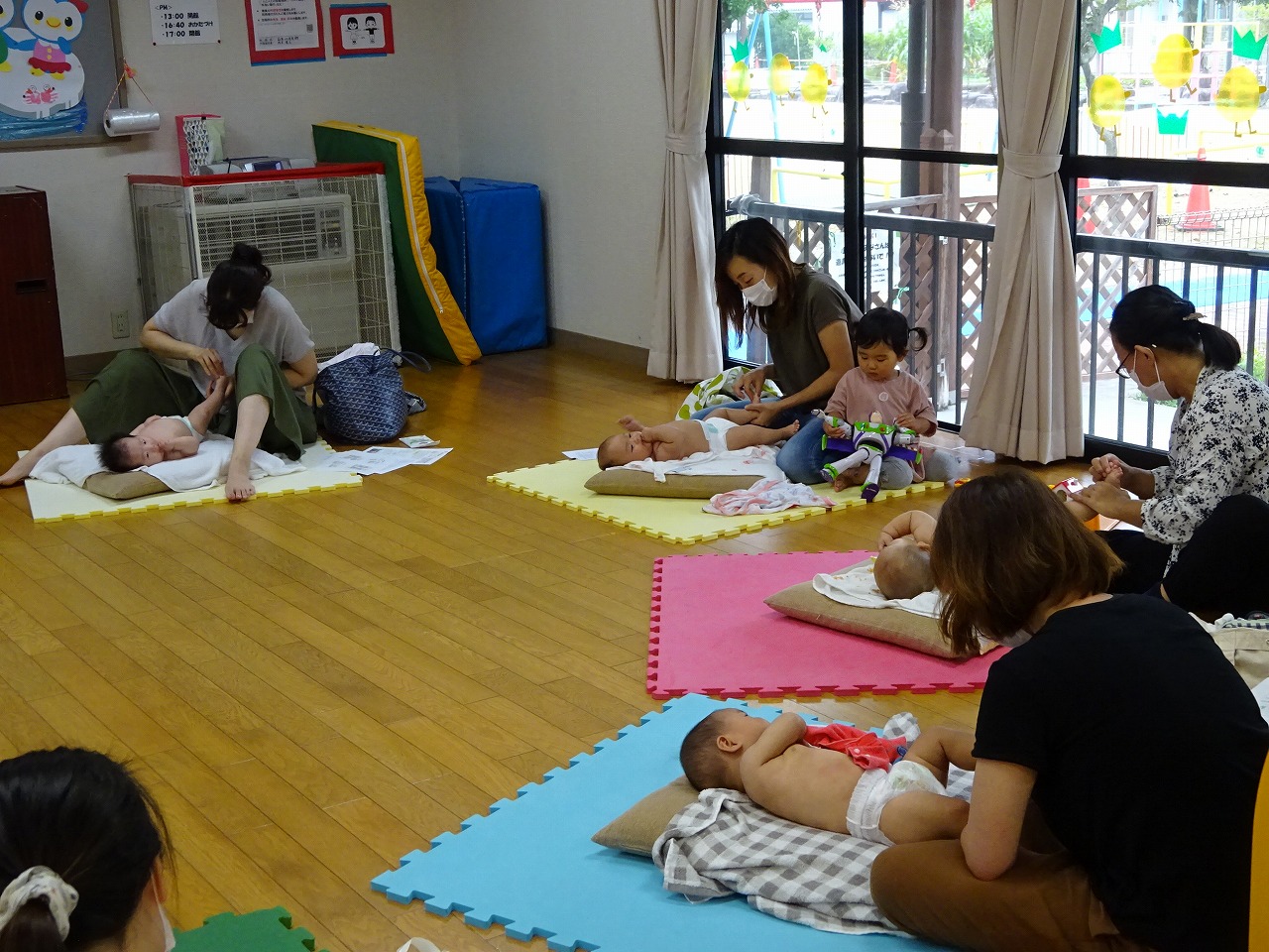 優しい親子の触れ合いの時間が流れていました。今回は2人目や3人目のお子さんのお母さんが多かったこともあり、普段上のお子さんがみえる中での1対1の時間はとても貴重だったのではと思います。毎回ですが、限定人数の枠を超えての希望者がみえ、ベビーマッサージりを多くの方が利用したいと思っているのだと感じます。